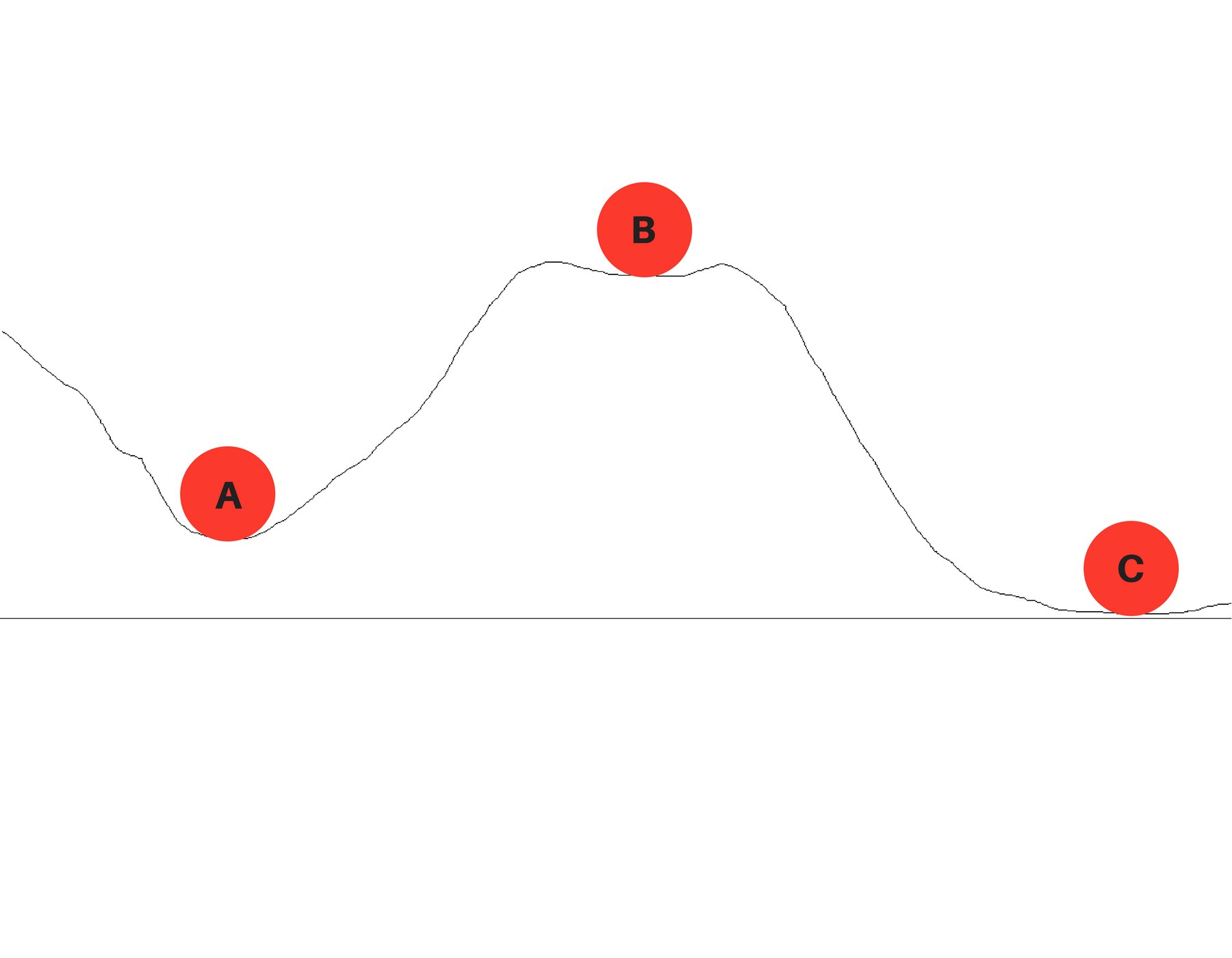 Tri kuglice jednakih masa nalaze se na različitim visinama u odnosu na tlo. Koja ima najmanju gravitacijsku potencijalnu energiju?
