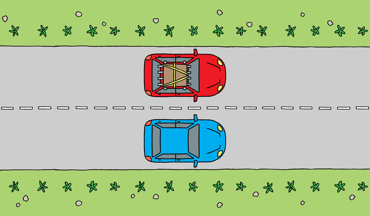 Dva jednaka automobila krenula su u isto vrijeme. Ukupna masa crvenog automobila veća je od mase plavog automobila. Gibaju se jednakim brzinama. Imaju li oba automobila energiju? Kako se zove ta energija? Je li energija tih dvaju automobila jednaka?