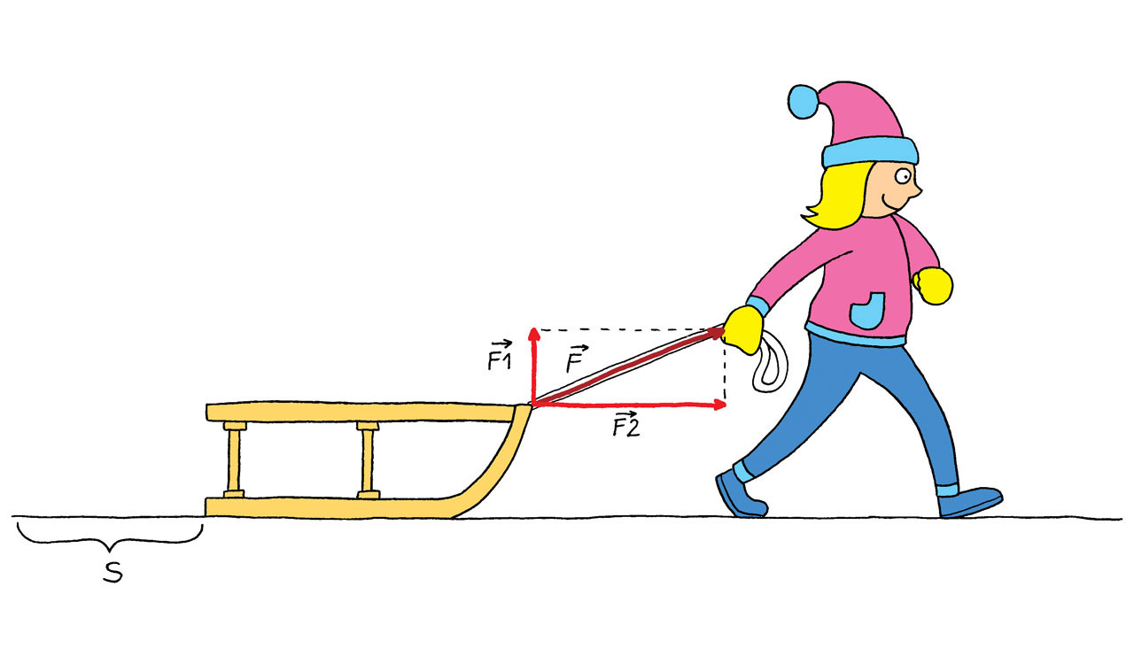 Djevojčica vuče sanjke po vodoravnoj podlozi. Sila kojom djevojčica vuče sanjke pod kutom je u odnosu na podlogu.