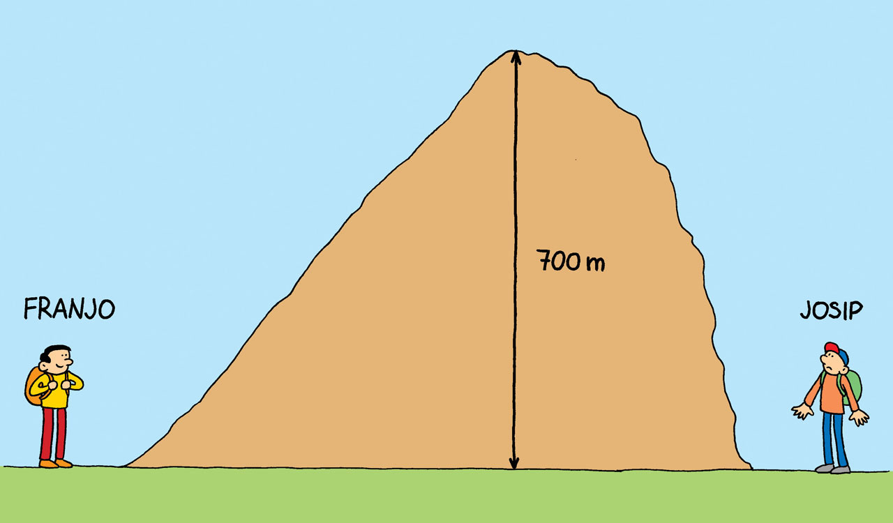 Penju se na brdo svaki sa svoje strane, kao što je prikazano na slici. Kakav je odnos rada koji su obavili Franjo i Josip, uspinjući se s naprtnjačom do vrha?