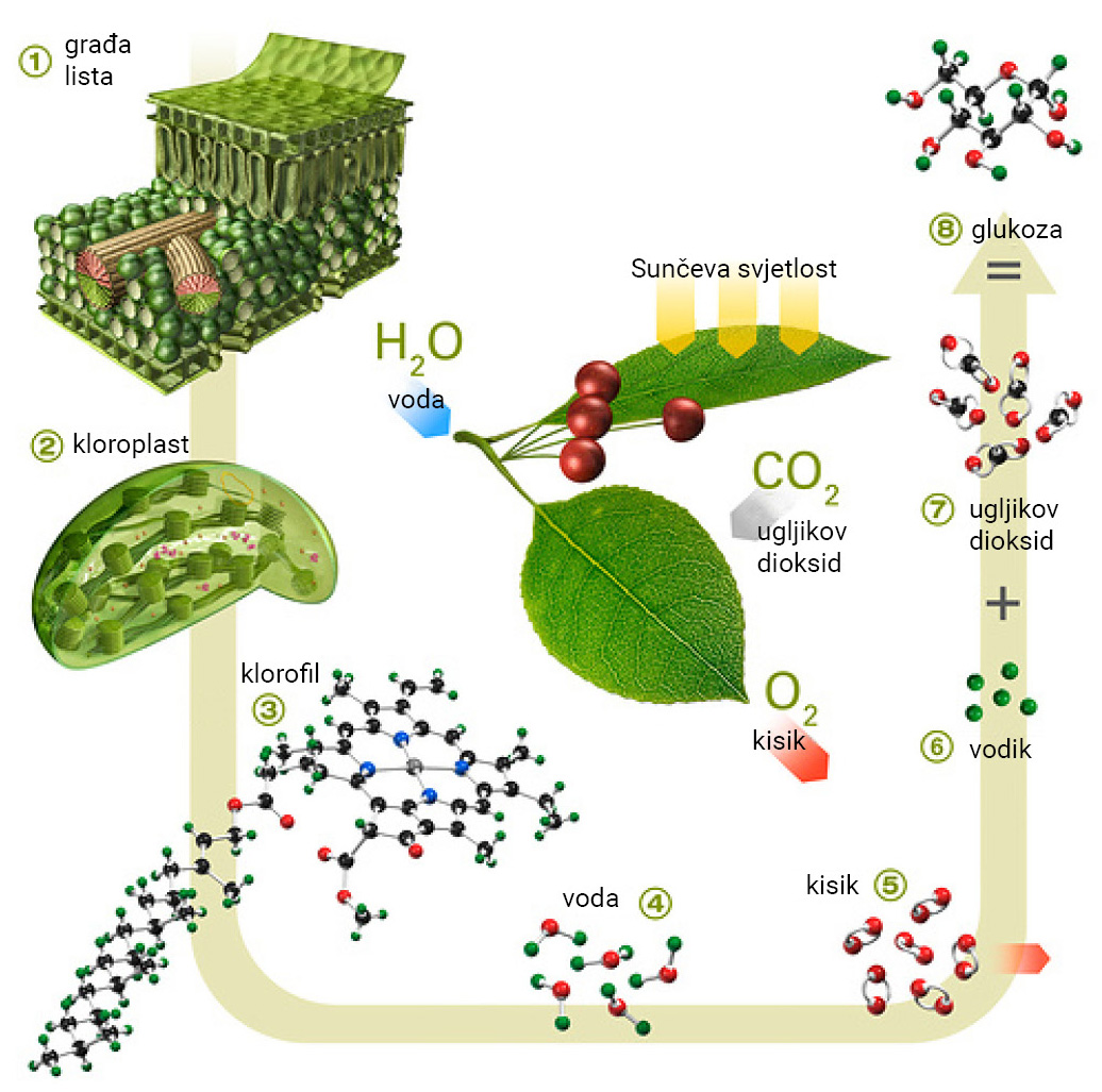 Fotosinteza je vrlo složen biokemijski proces, ali jednostavno kažemo da fotozintezom iz vode i ugljikova dioksida nastaju glukoza i kisik.