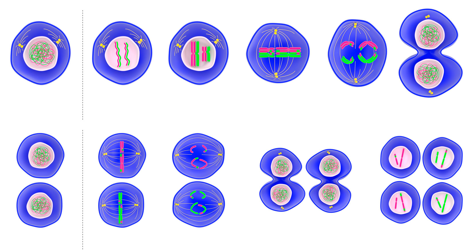 Za razliku od mitoze, mejozom nastaju spolne stanice. Pritom iz jedne diploidne stanice nastaju četiri genski različite haploidne stanice.