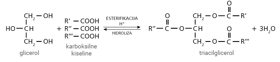 Stoga u procesu esterifikacije jedna molekula glicerola veže tri molekule karboksilne kiseline i nastaju mast i tri molekule vode.