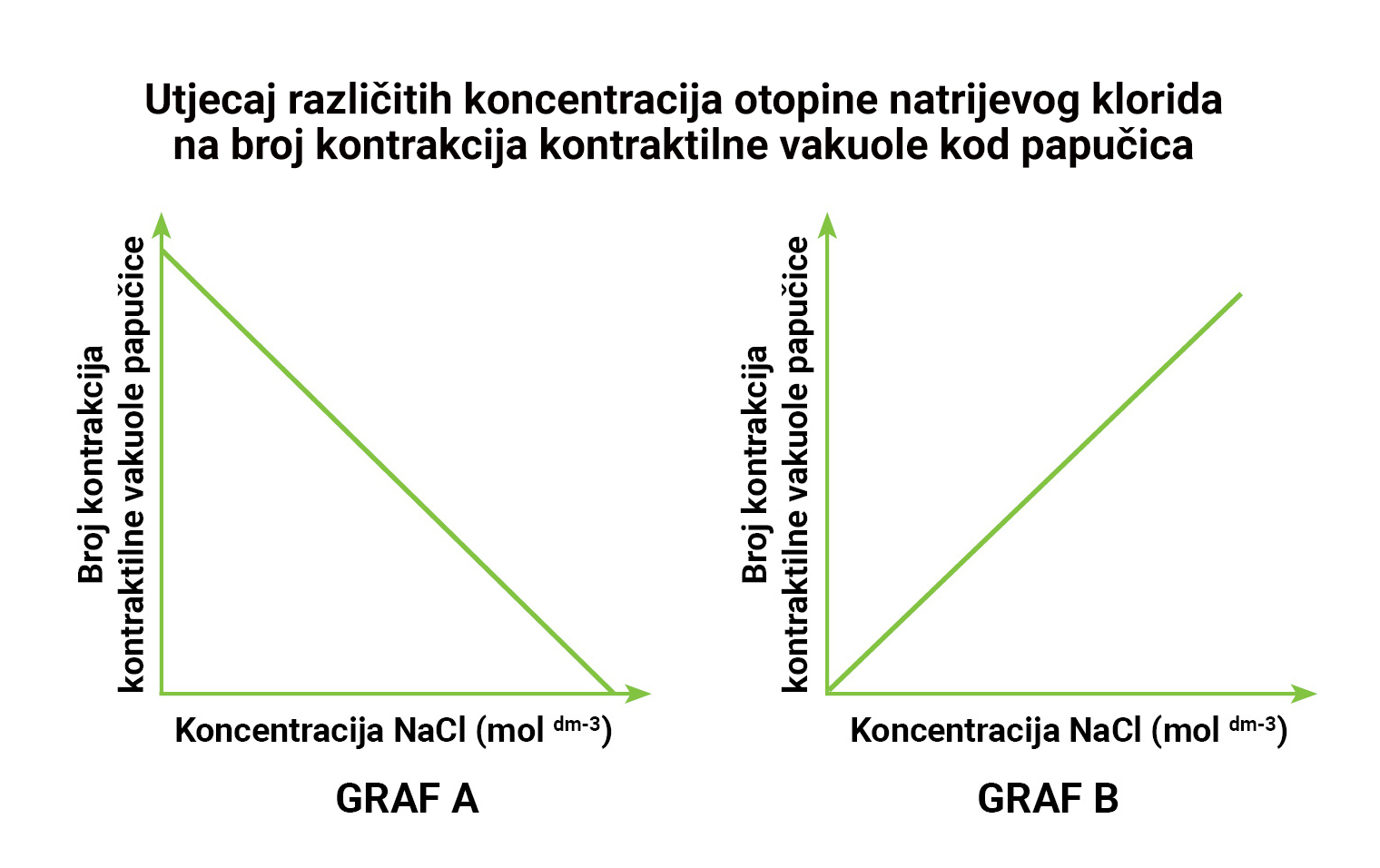 c) Analizirajte grafove A i B. Koji graf točno prikazuje utjecaj povećanja koncentracije otopine natrijevog klorida na učestalost kontrakcija kontraktilne vakuole papučice? Objasnite svoj odgovor.