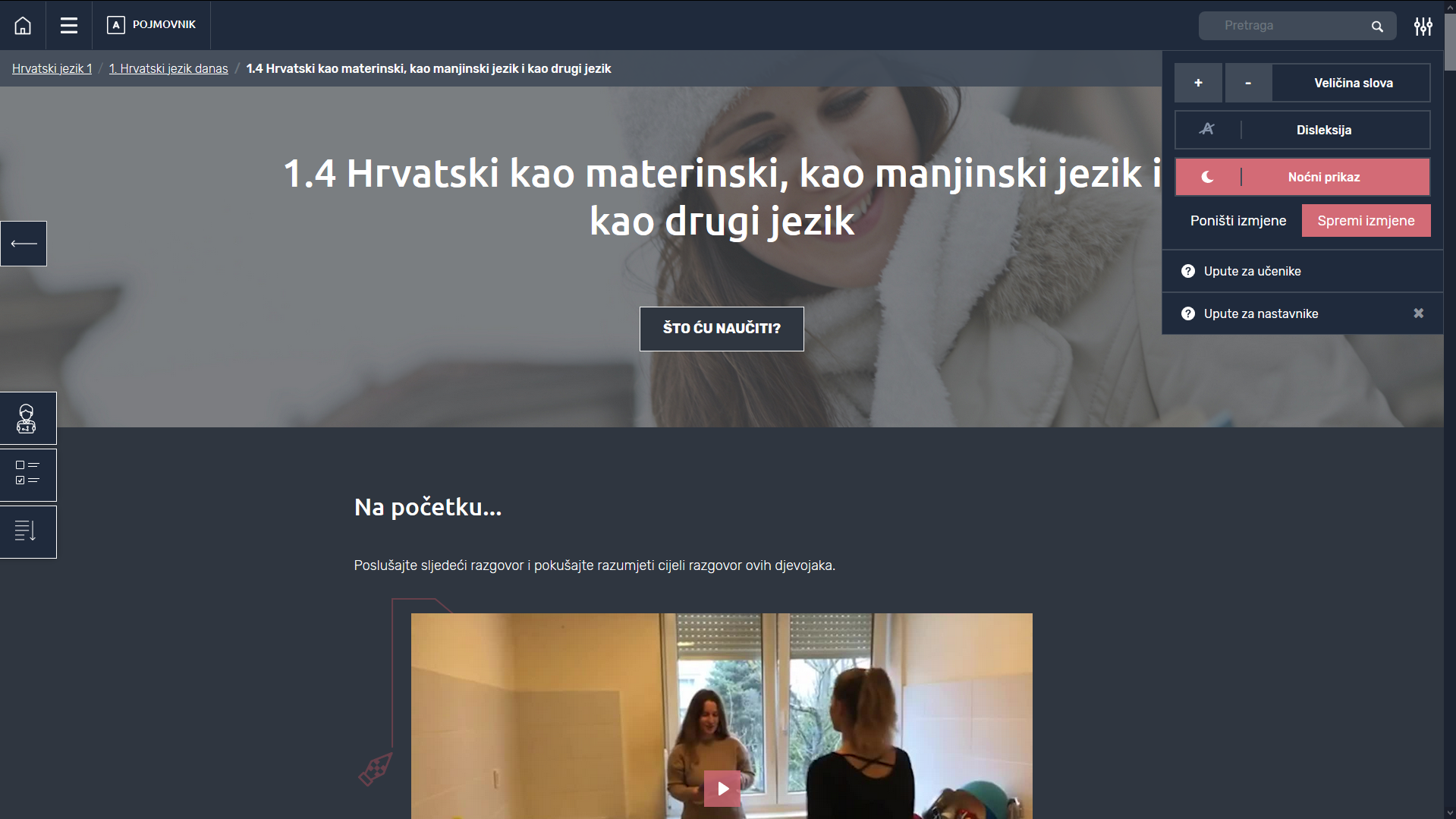 Izbornik za pristupačnost omogućuje promjenu veličine slova na stranicama sadržaja, uključivanje i isključivanje fonta za disleksiju te uključivanje i isključivanje noćnog prikaza.