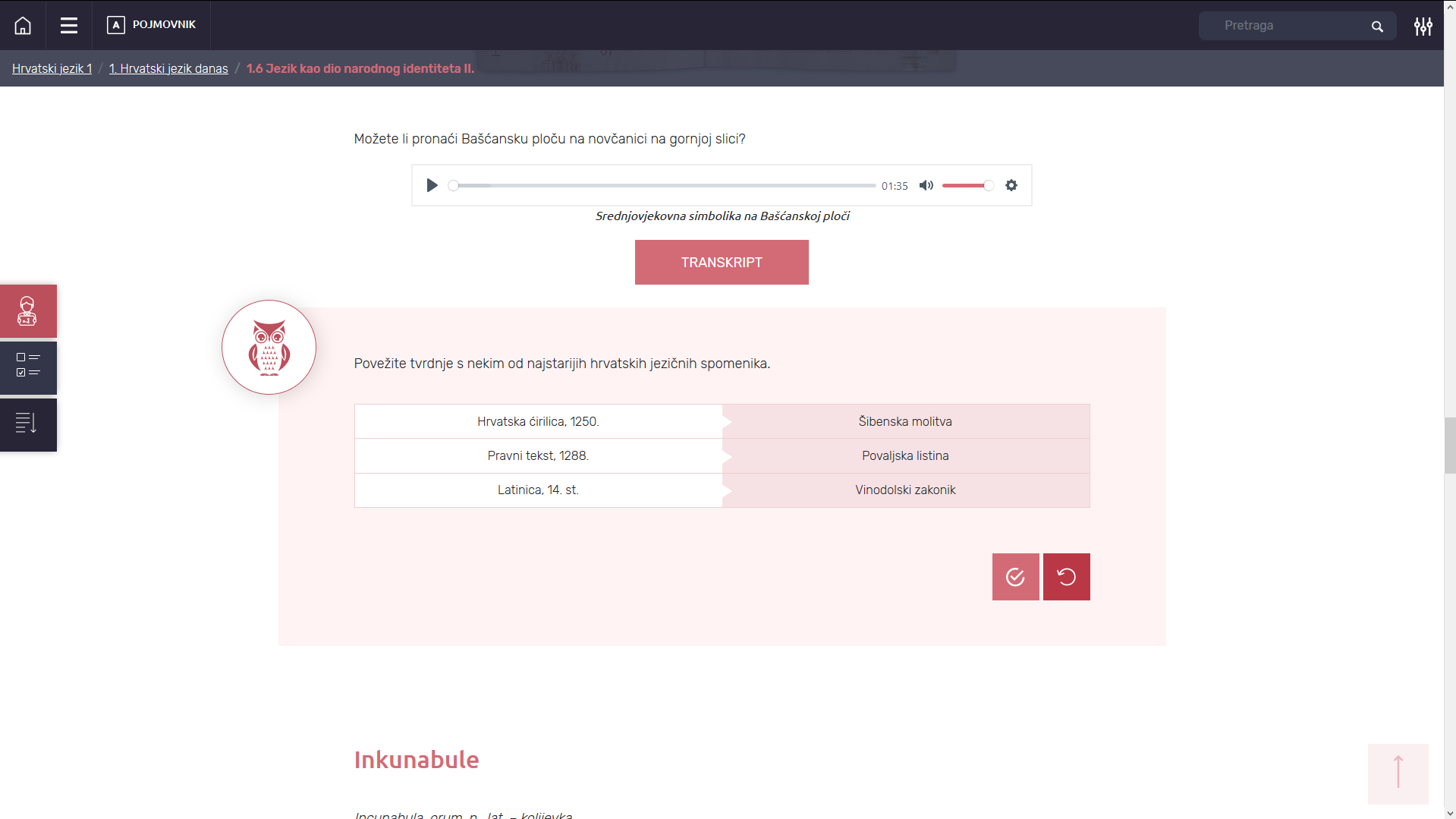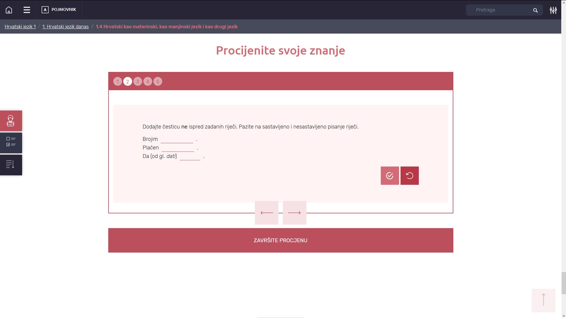 Kada se nalazimo na stranici pojedine jedinice, možemo prelaziti na prethodnu ili sljedeću jedinicu pomoću strelica u zaglavlju stranice. Pristup do svih jedinica u modulu omogućen je uz pomoć odabira rednog broja pojedine jedinice i direktnog pristupa prvoj i zadnjoj jedinici.