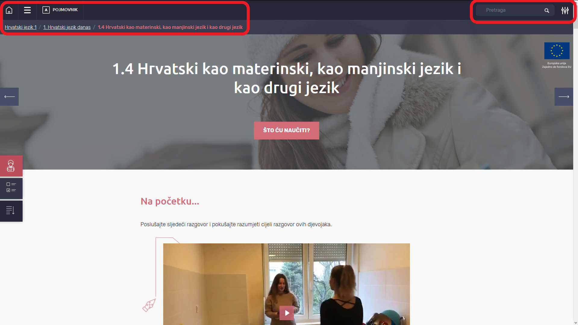 Pri vrhu zaslona nalazi se navigacijska traka koja u svakom trenutku, prikazuje u kojem se dijelu sadržaja nalazimo, a to se vidi kroz naziv predmeta, modula i jedinicu. Odabirom naziva predmeta vraćamo se na početnu stranicu s popisom modula.