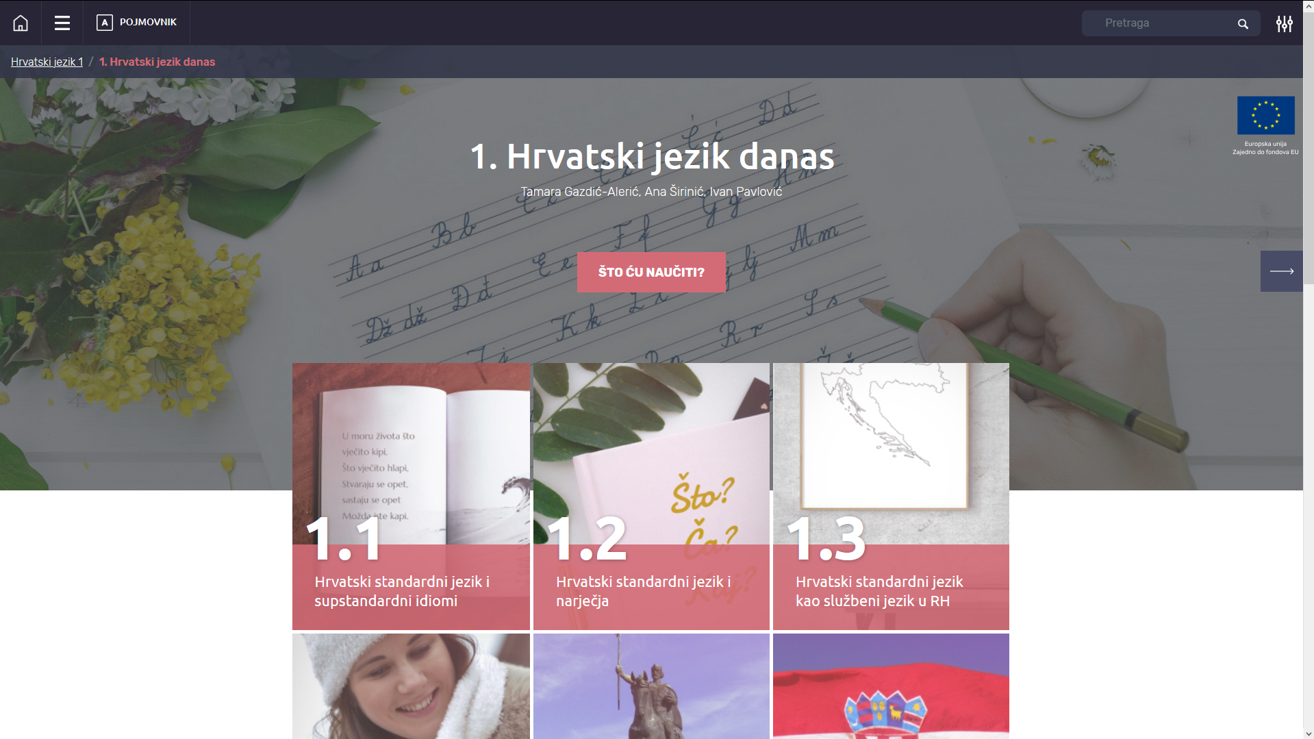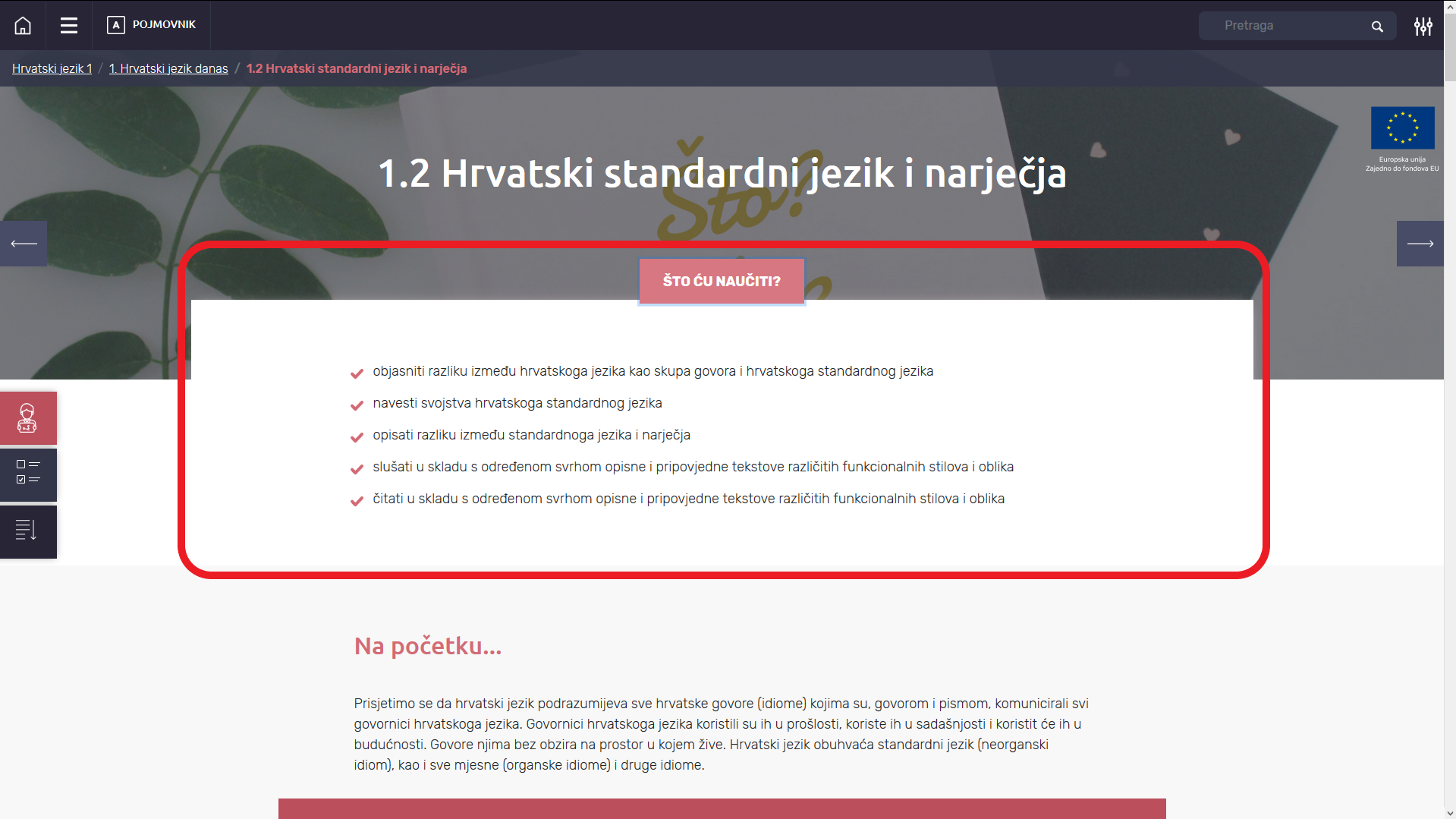 Na vrhu svake stranice u strukturi sadržaja, bez obzira na to radi li se o cijelom digitalnom sadržaju za pojedini razred, modulu ili jedinici, nalazi se gumb „Što ću naučiti“ gdje se nalazi popis obrazovnih ishoda za taj digitalni obrazovni sadržaj, modul ili jedinicu.