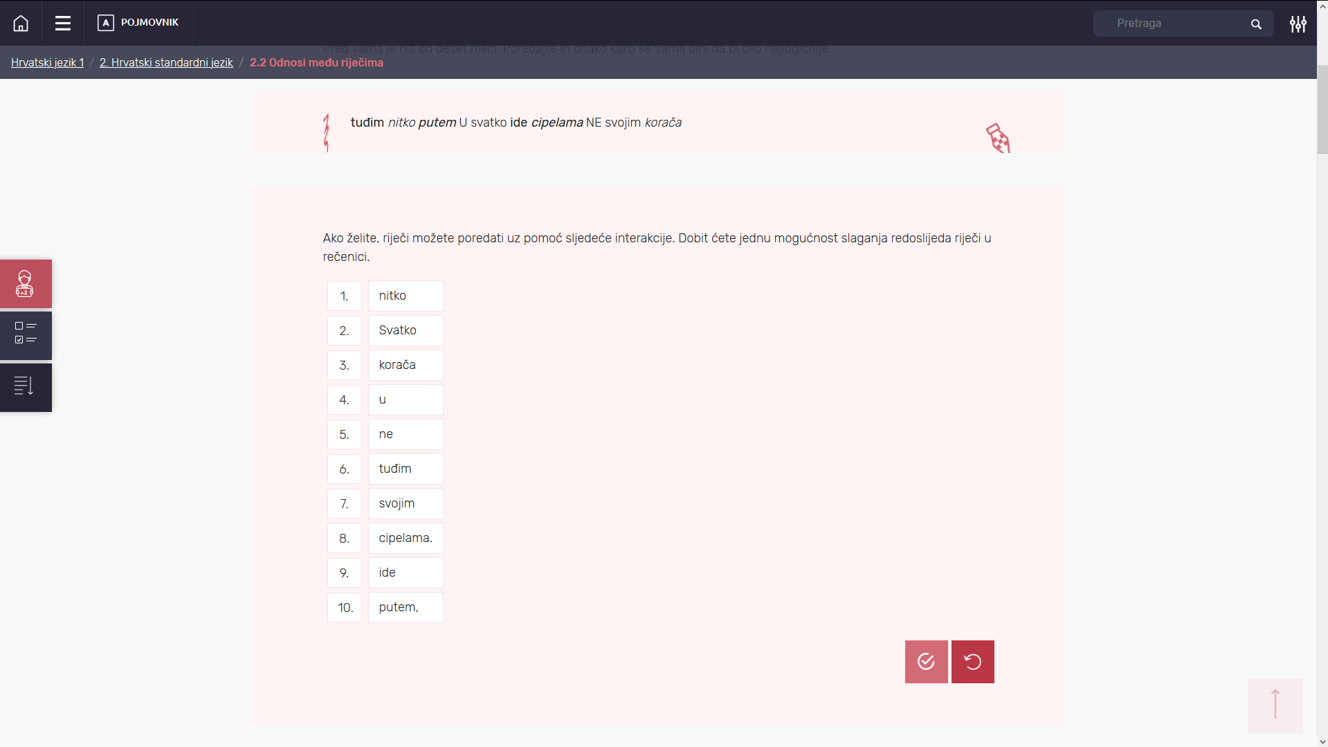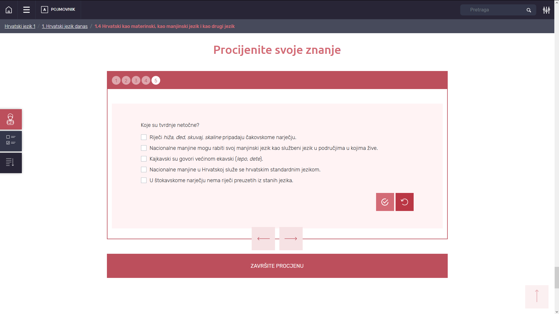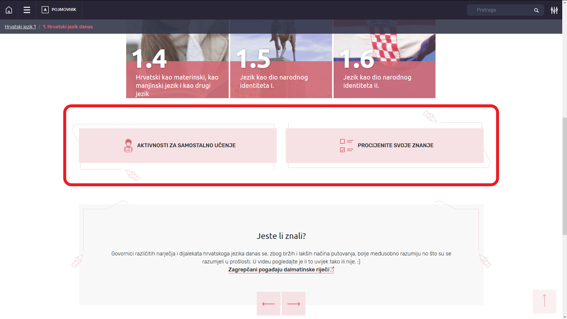 Kada se nalazimo na stranici pojedine jedinice, možemo prelaziti na prethodnu ili sljedeću jedinicu pomoću strelica u zaglavlju stranice. Pristup do svih jedinica u modulu omogućen je uz pomoć odabira rednog broja pojedine jedinice i direktnog pristupa prvoj i zadnjoj jedinici.