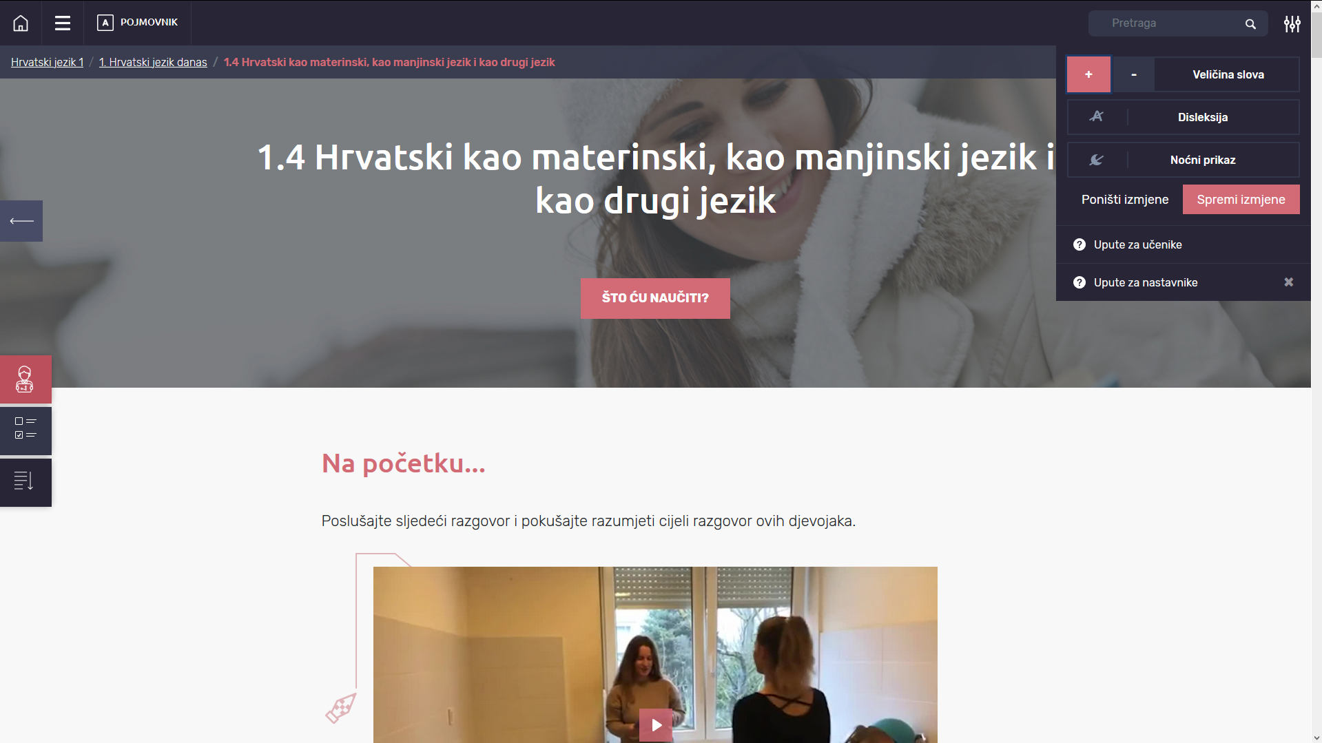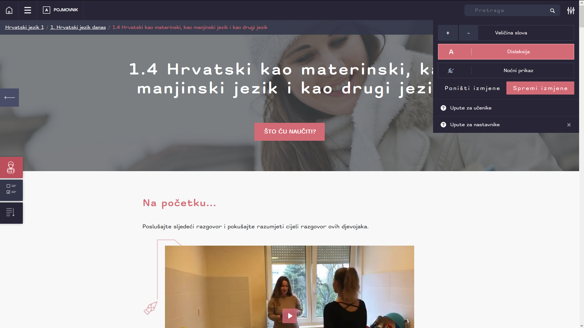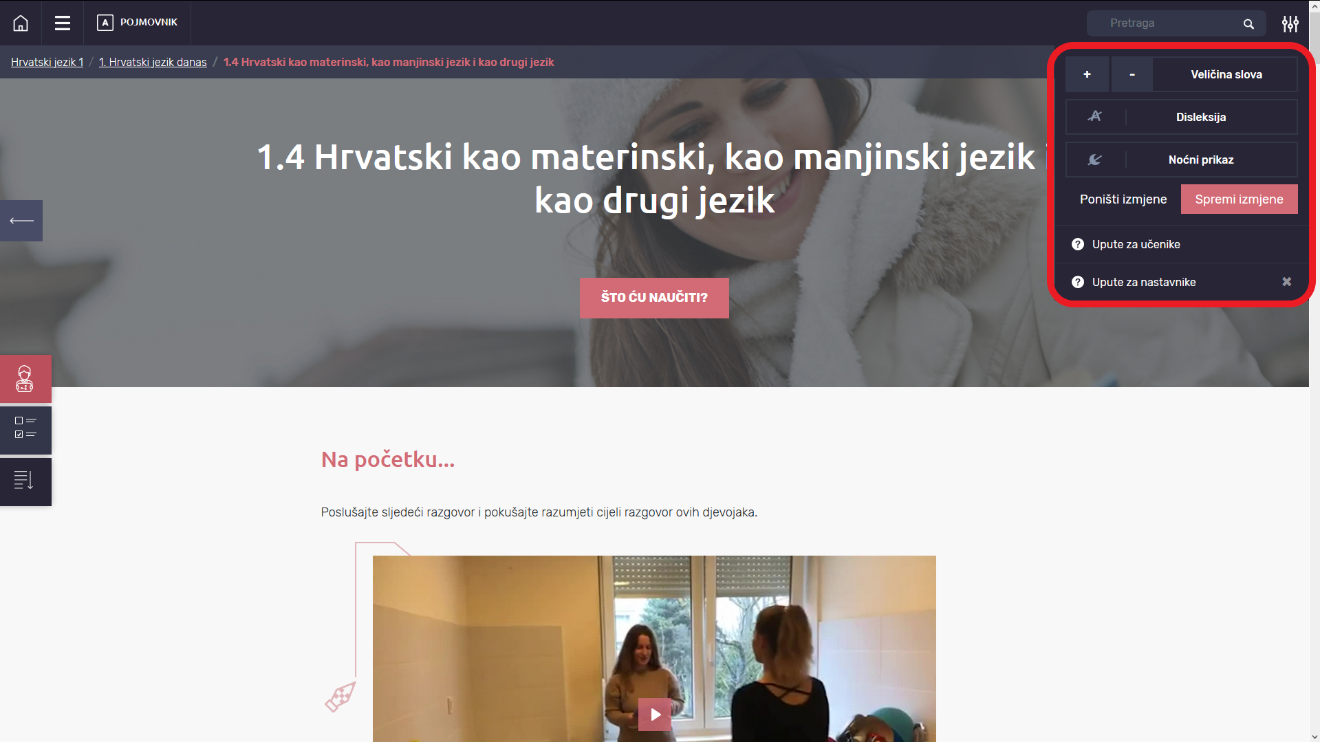 Izbornik za pristupačnost omogućuje promjenu veličine slova na stranicama sadržaja, uključivanje i isključivanje fonta za disleksiju te uključivanje i isključivanje noćnog prikaza.