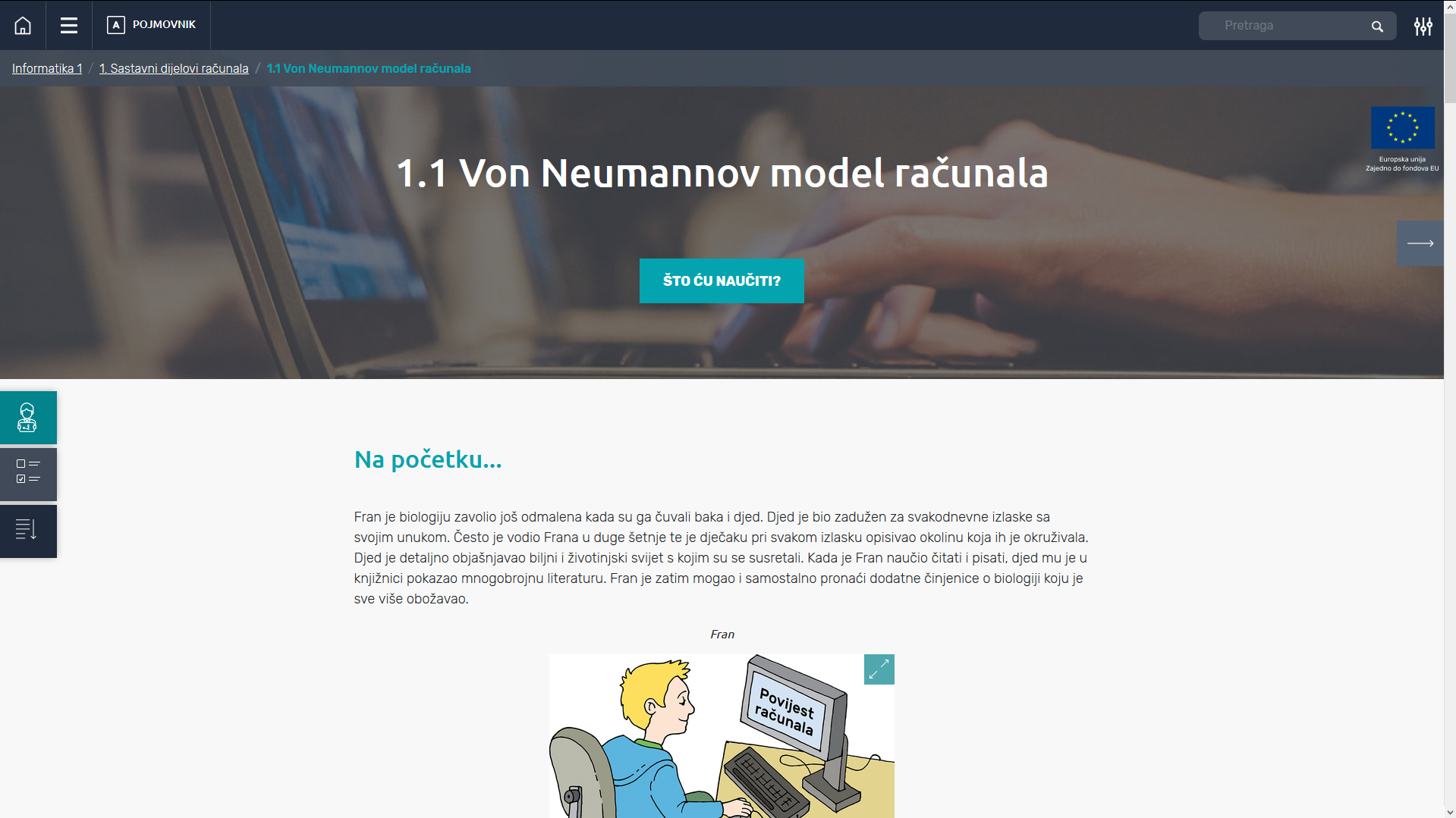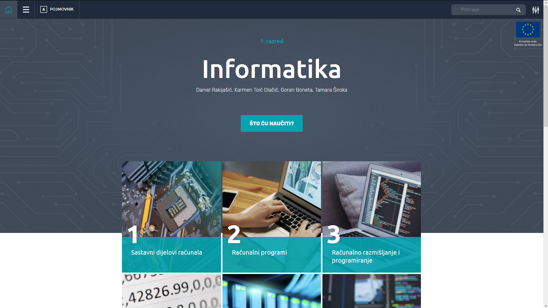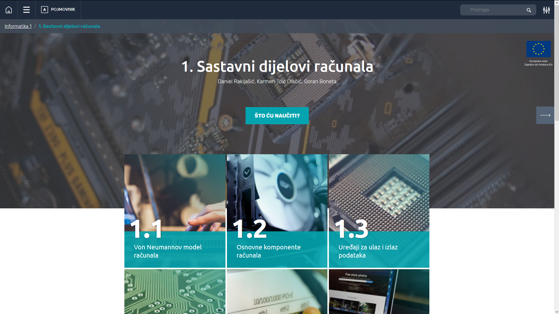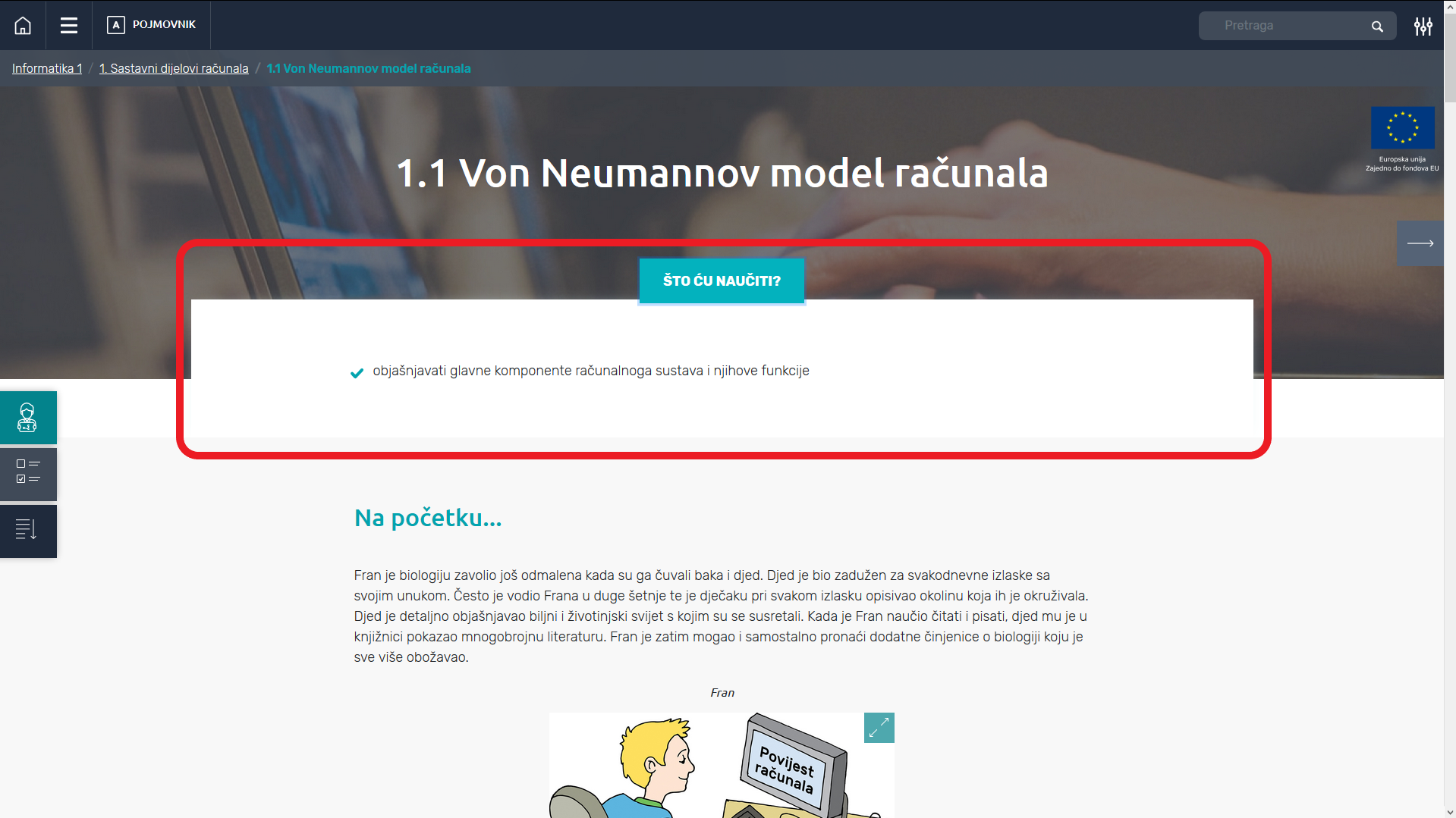 Na vrhu svake stranice u strukturi sadržaja, bez obzira na to radi li se o cijelom digitalnom sadržaju za pojedini razred, modulu ili jedinici, nalazi se gumb „Što ću naučiti“ gdje se nalazi popis obrazovnih ishoda za taj digitalni obrazovni sadržaj, modul ili jedinicu.