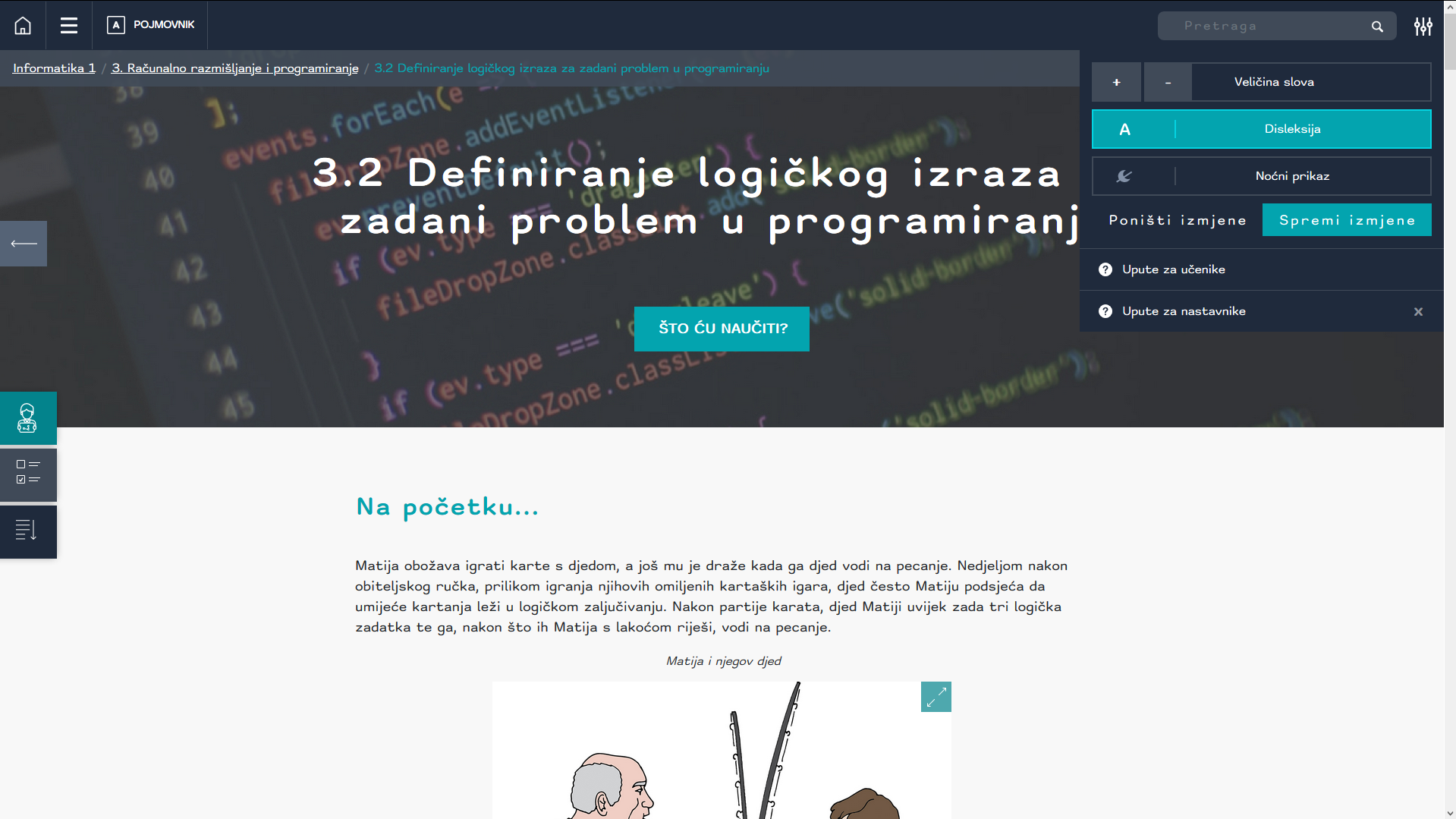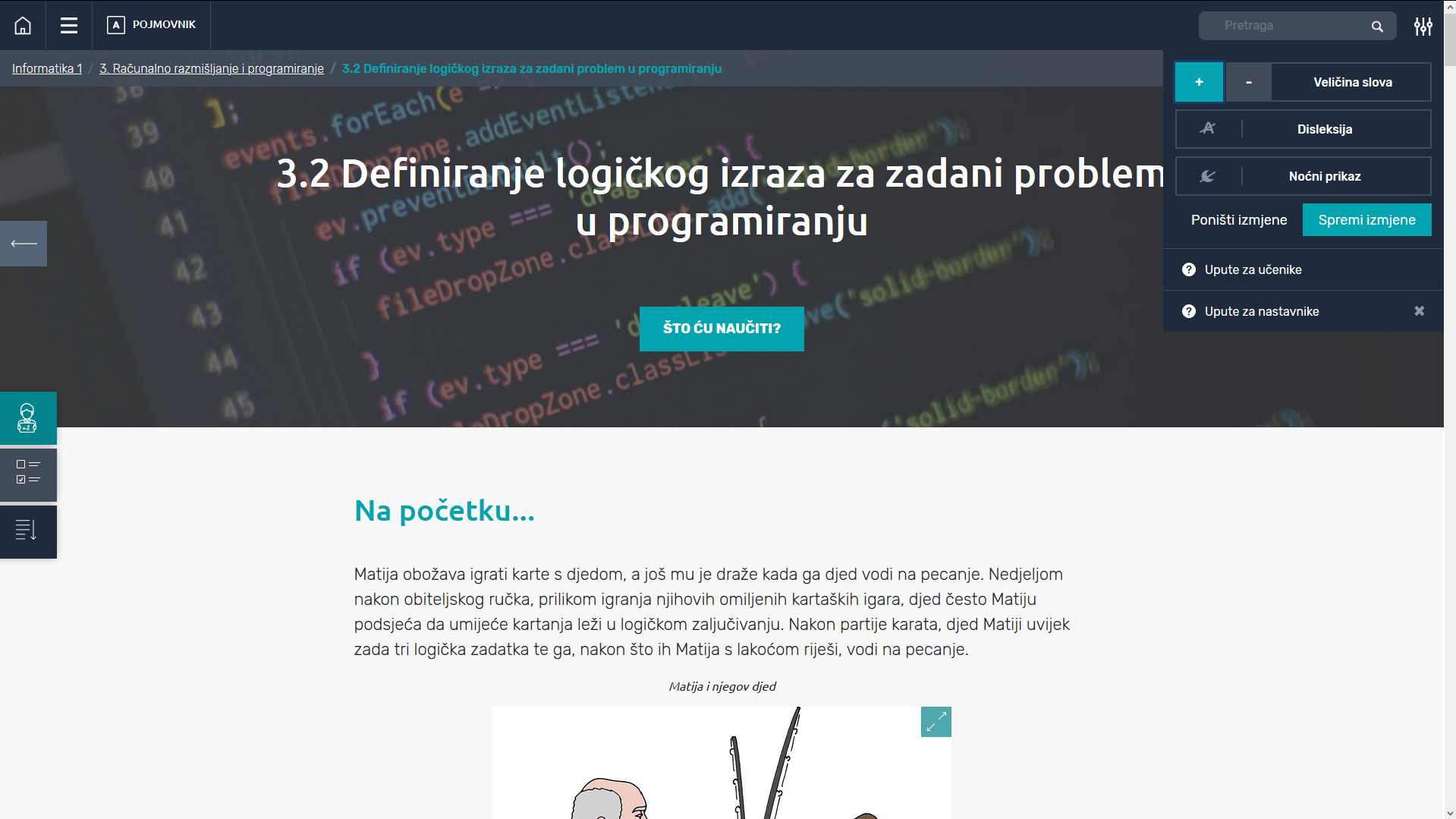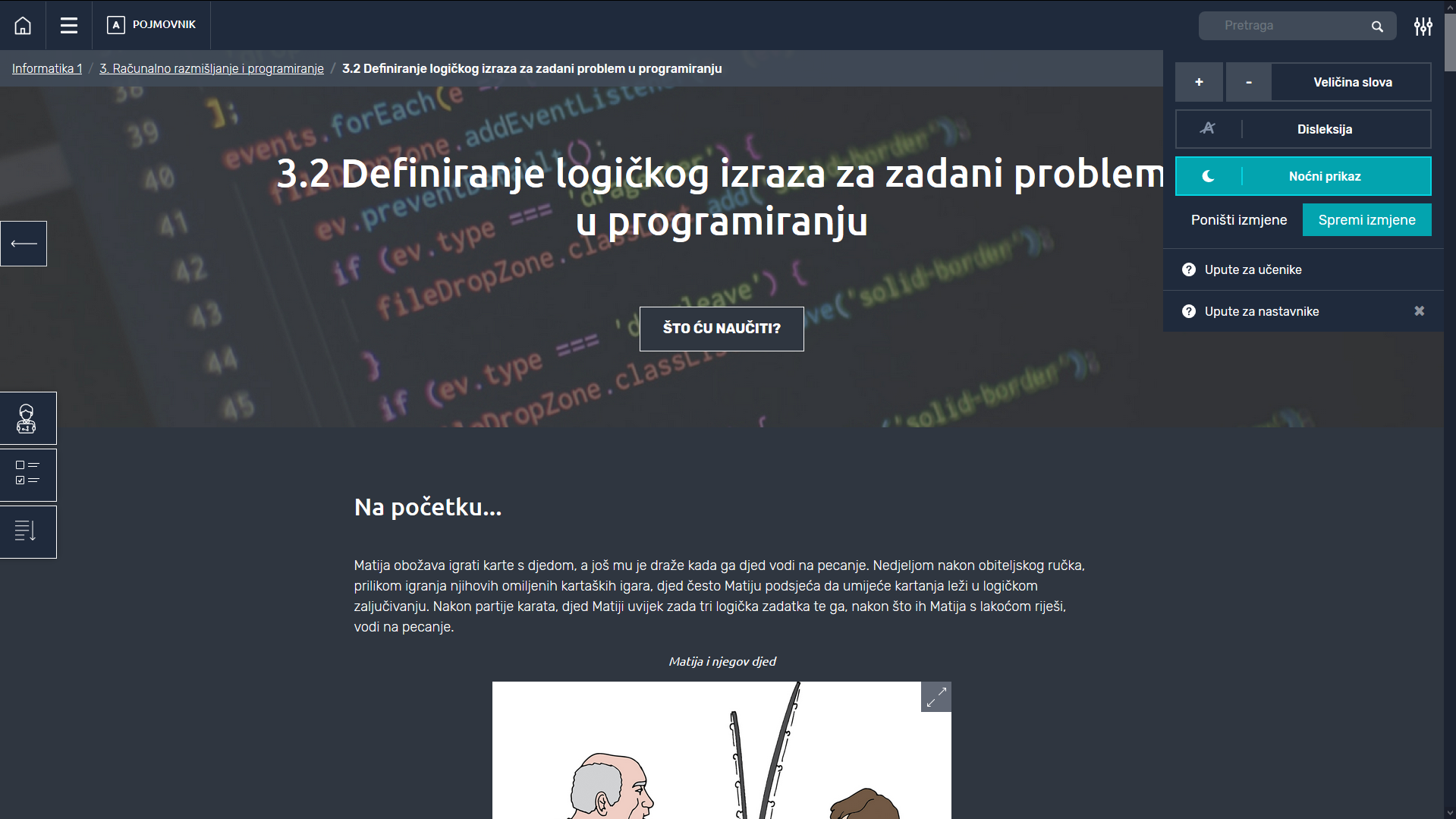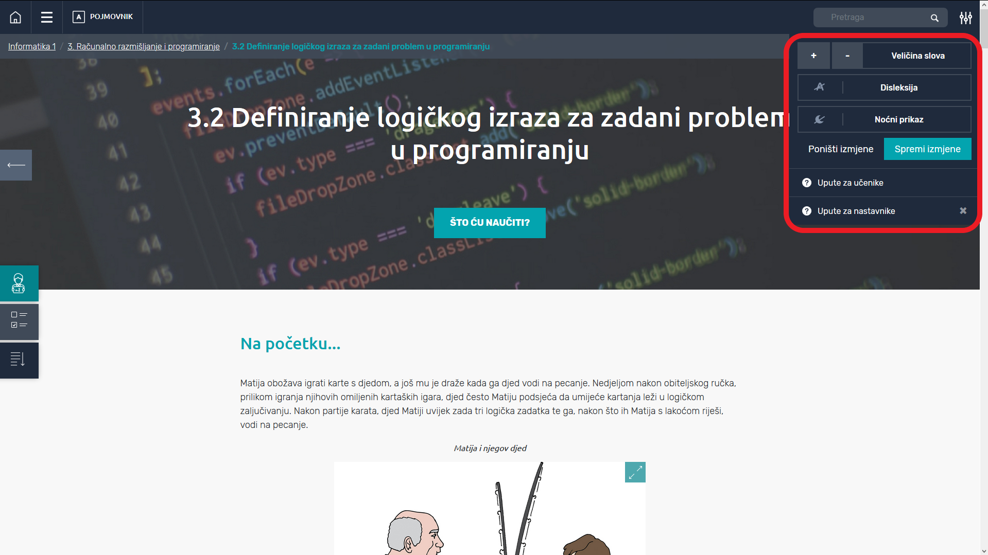 Izbornik za pristupačnost omogućuje promjenu veličine slova na stranicama sadržaja, uključivanje i isključivanje fonta za disleksiju te uključivanje i isključivanje noćnog prikaza.