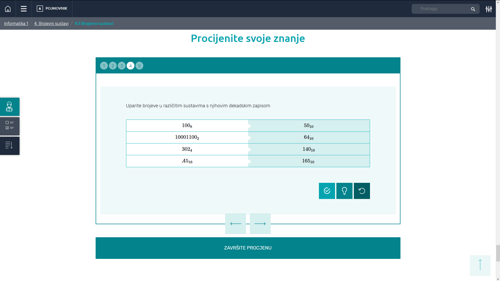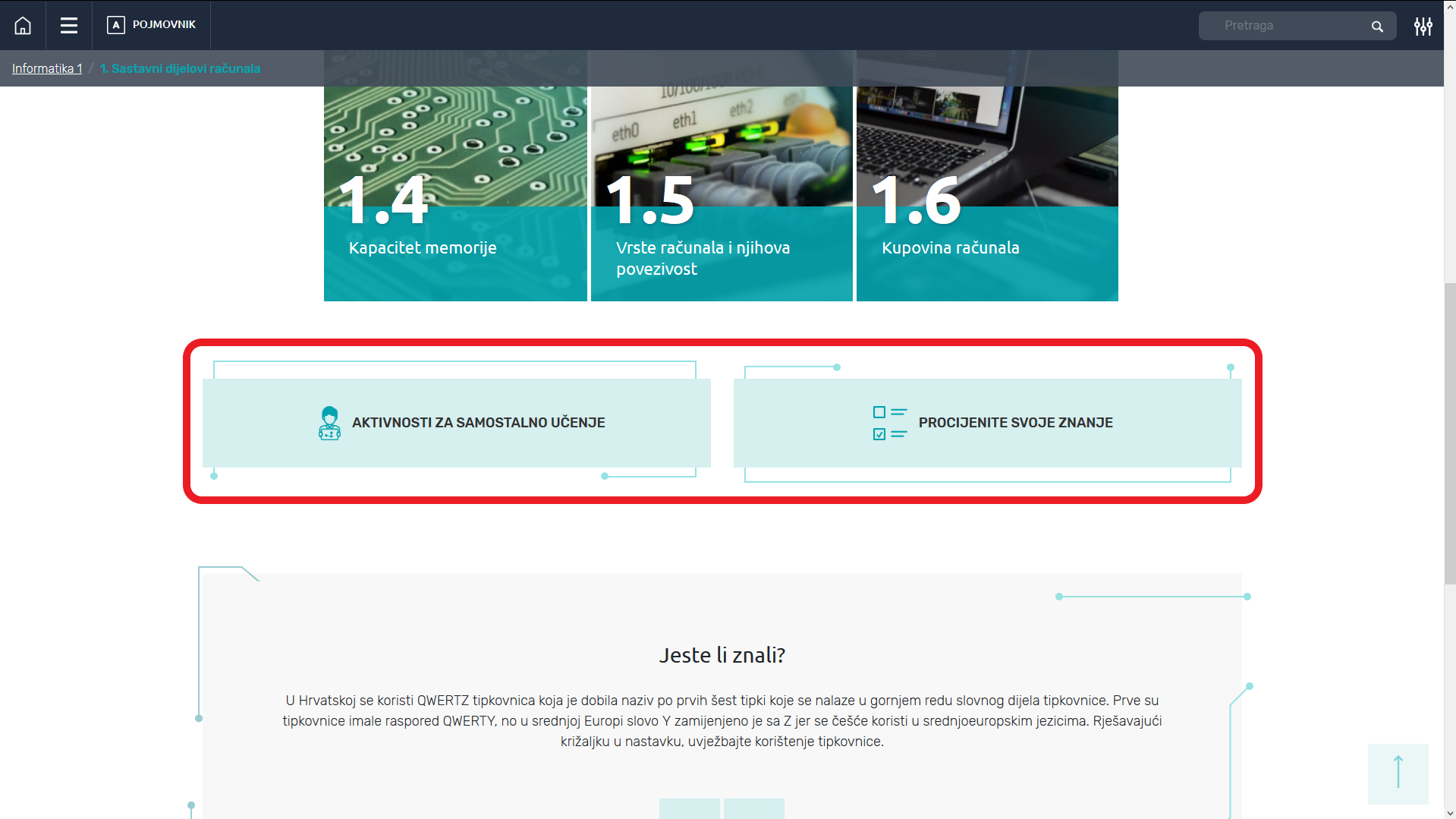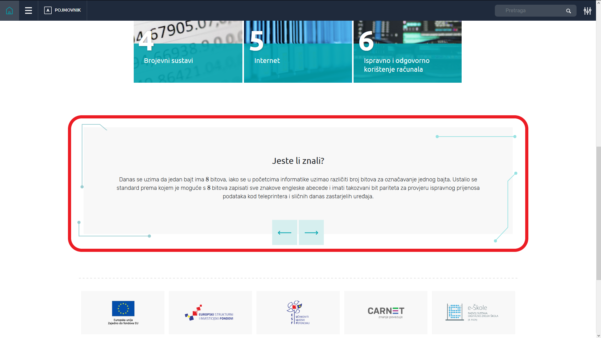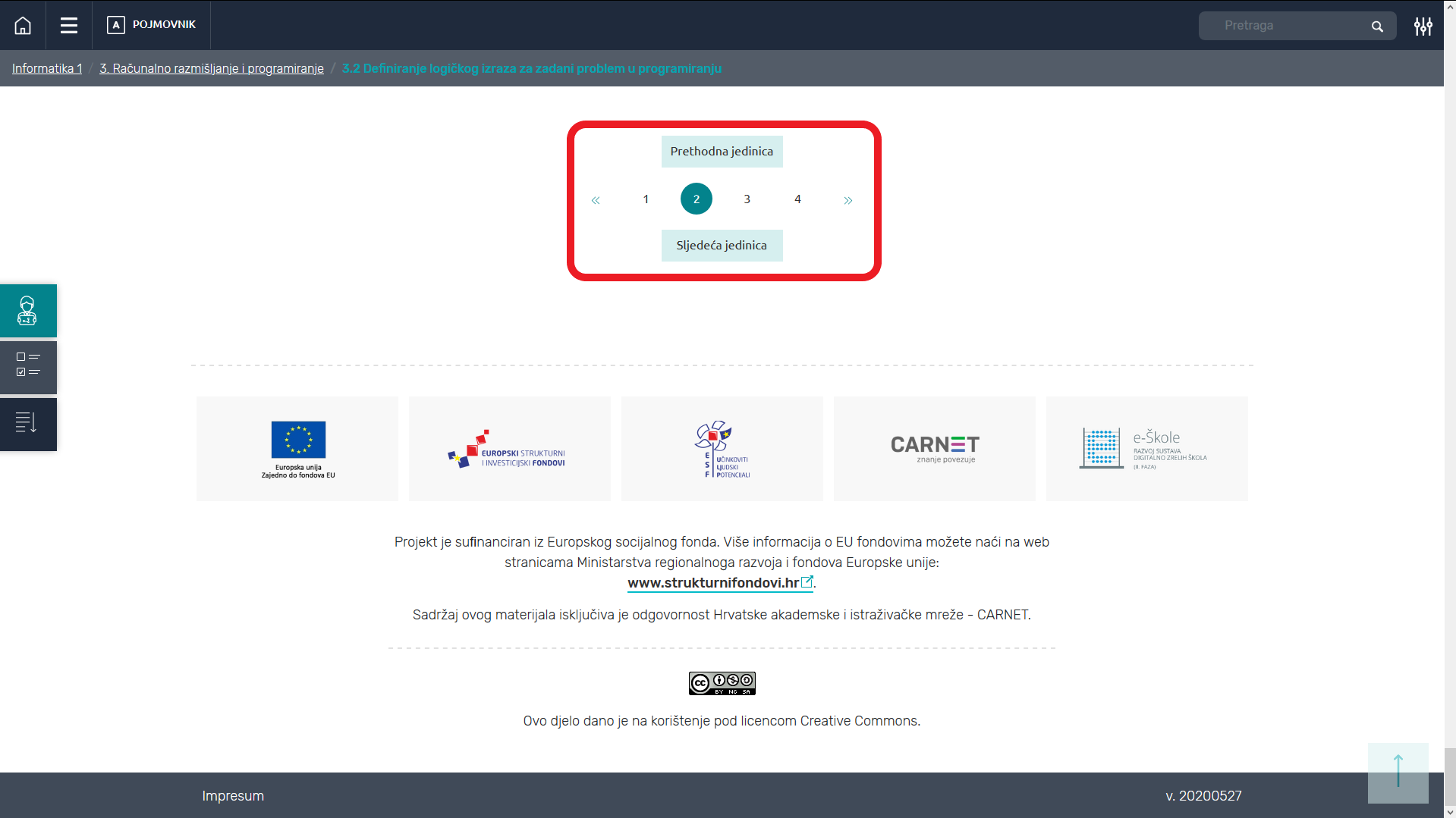 Kada se nalazimo na stranici pojedine jedinice, možemo prelaziti na prethodnu ili sljedeću jedinicu pomoću strelica u zaglavlju stranice. Pristup do svih jedinica u modulu omogućen je uz pomoć odabira rednog broja pojedine jedinice i direktnog pristupa prvoj i zadnjoj jedinici.