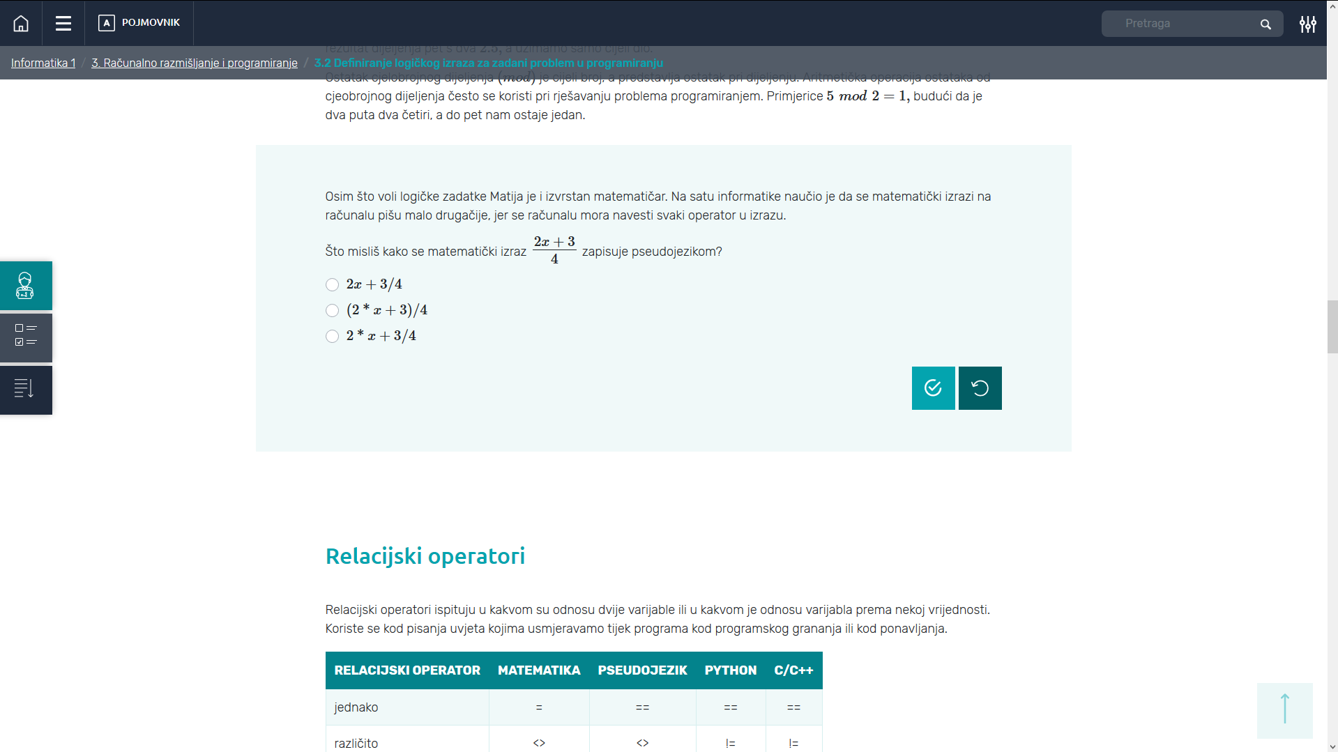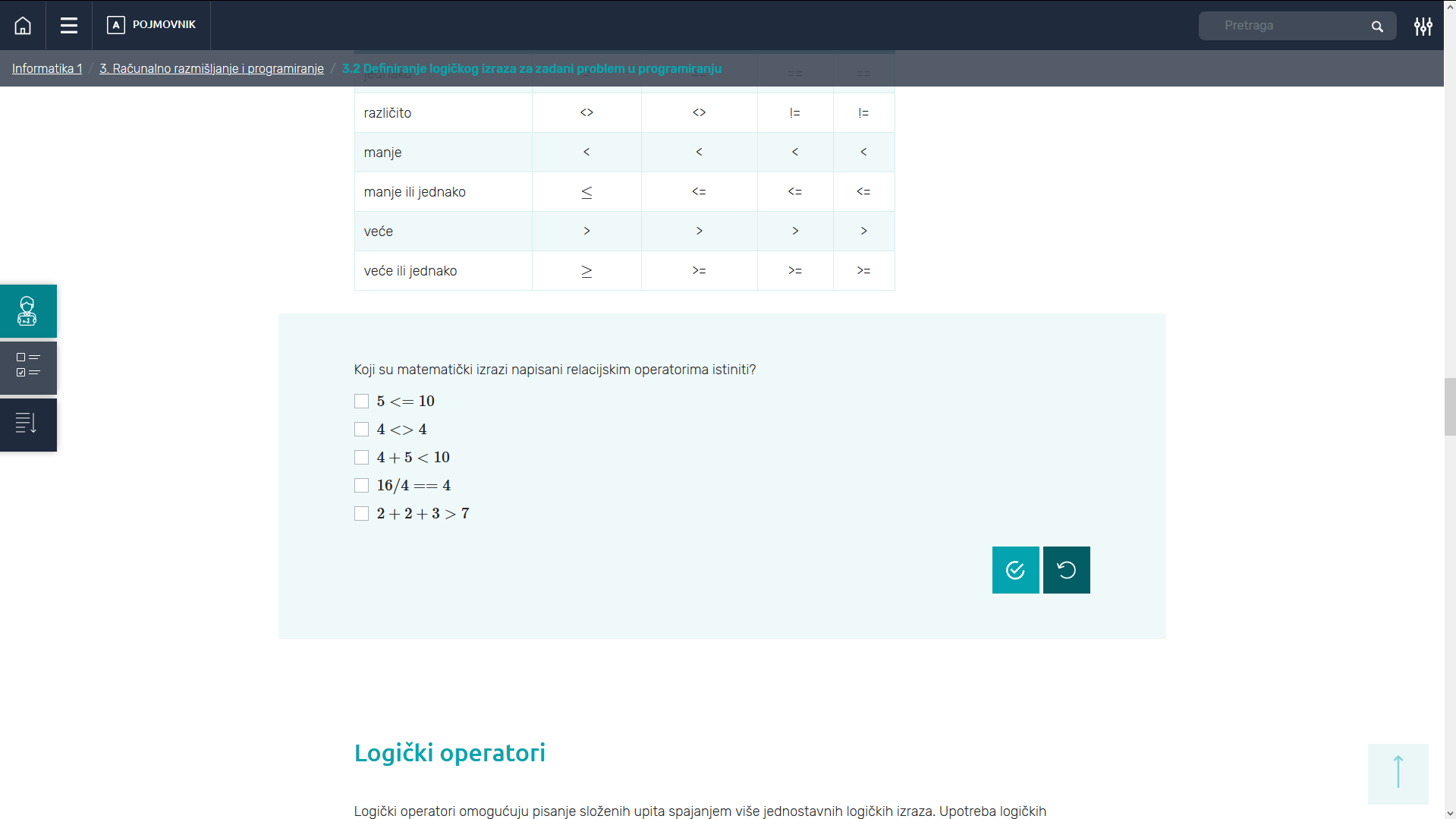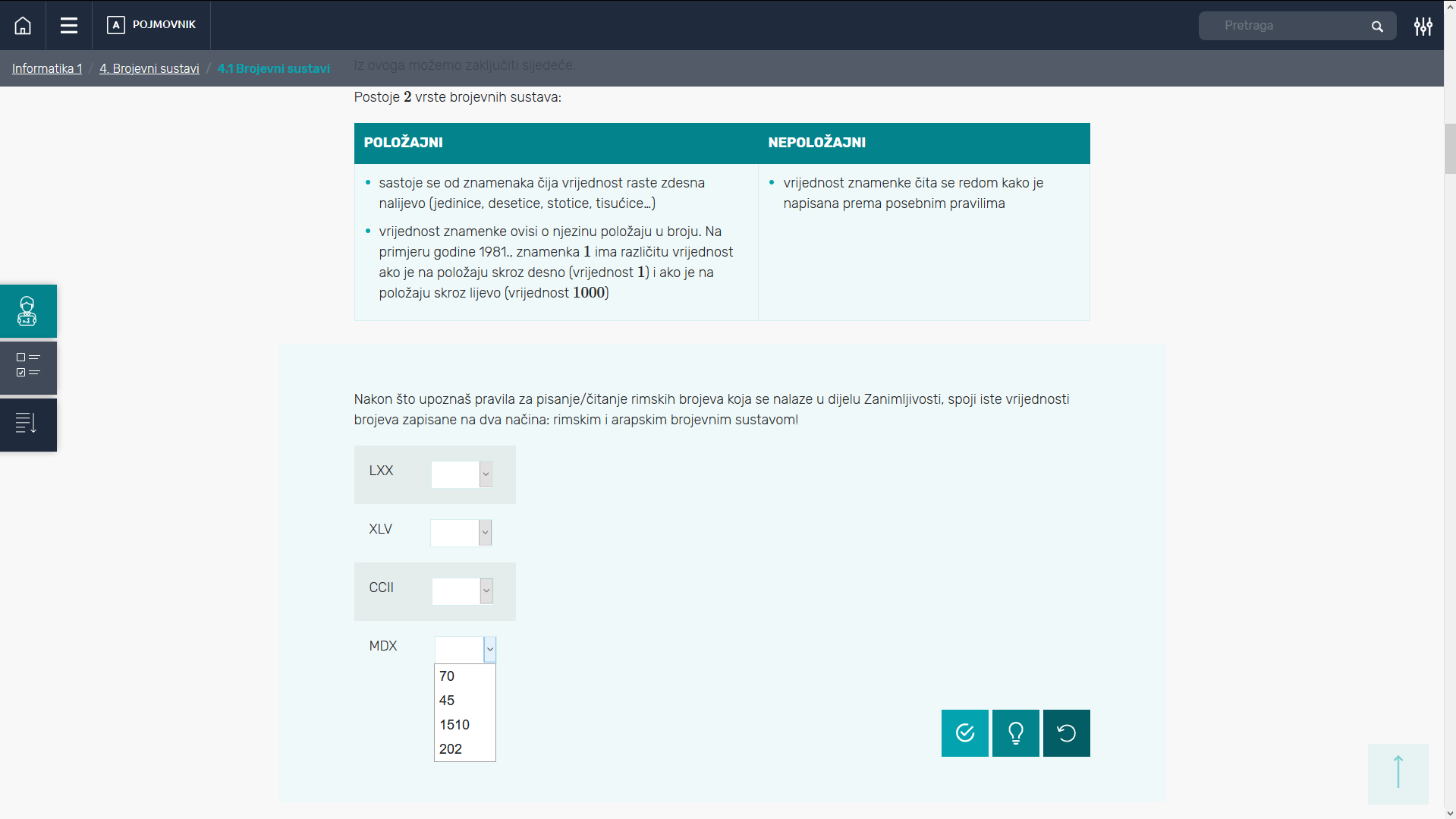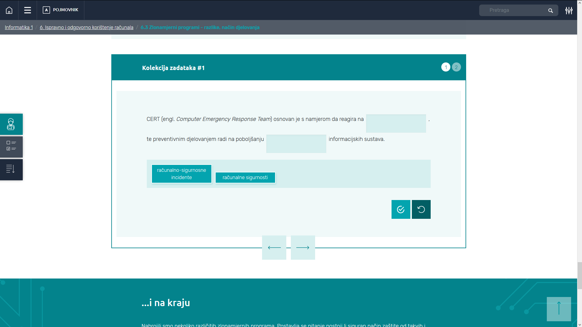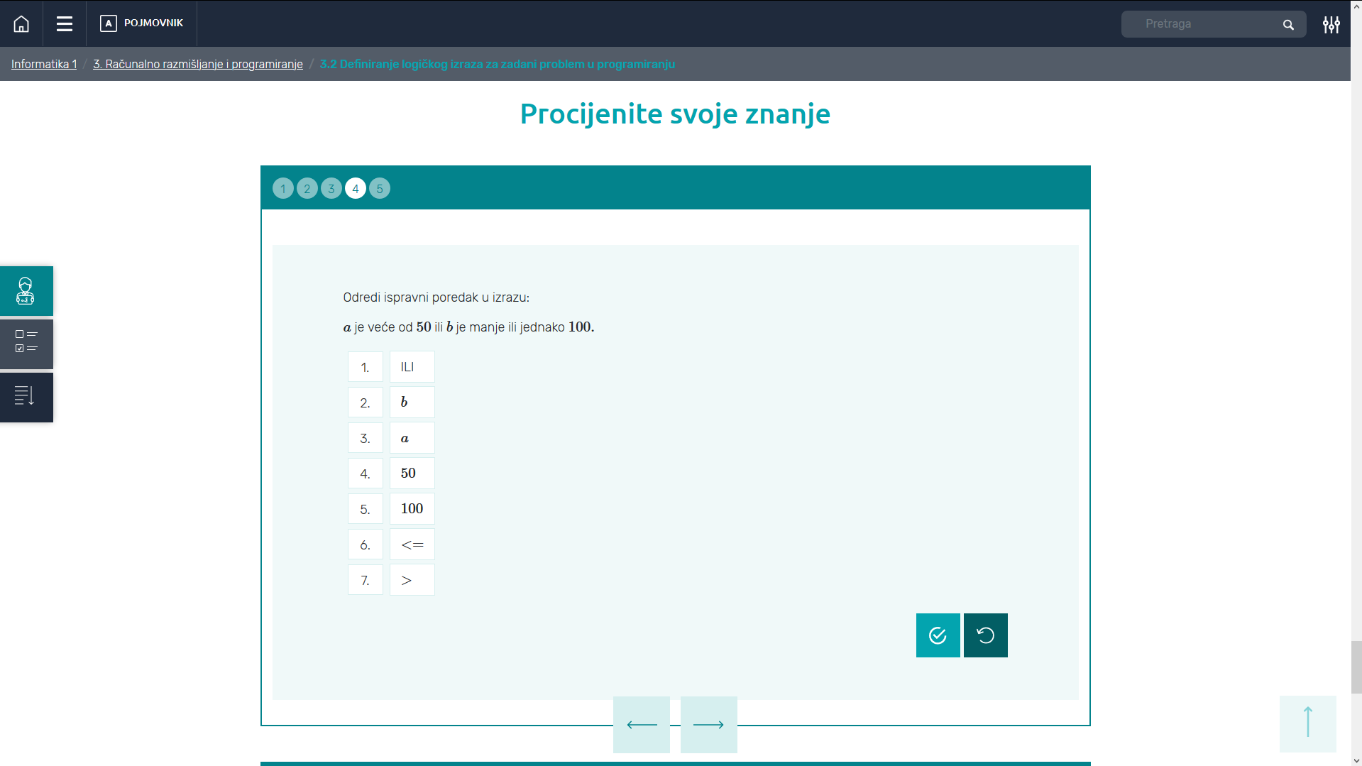 Kada se nalazimo na stranici pojedine jedinice, možemo prelaziti na prethodnu ili sljedeću jedinicu pomoću strelica u zaglavlju stranice. Pristup do svih jedinica u modulu omogućen je uz pomoć odabira rednog broja pojedine jedinice i direktnog pristupa prvoj i zadnjoj jedinici.