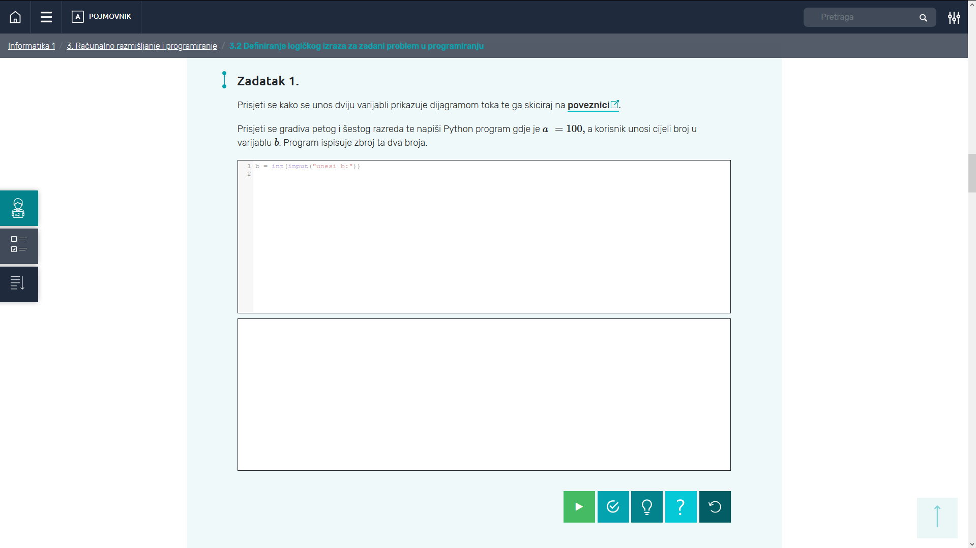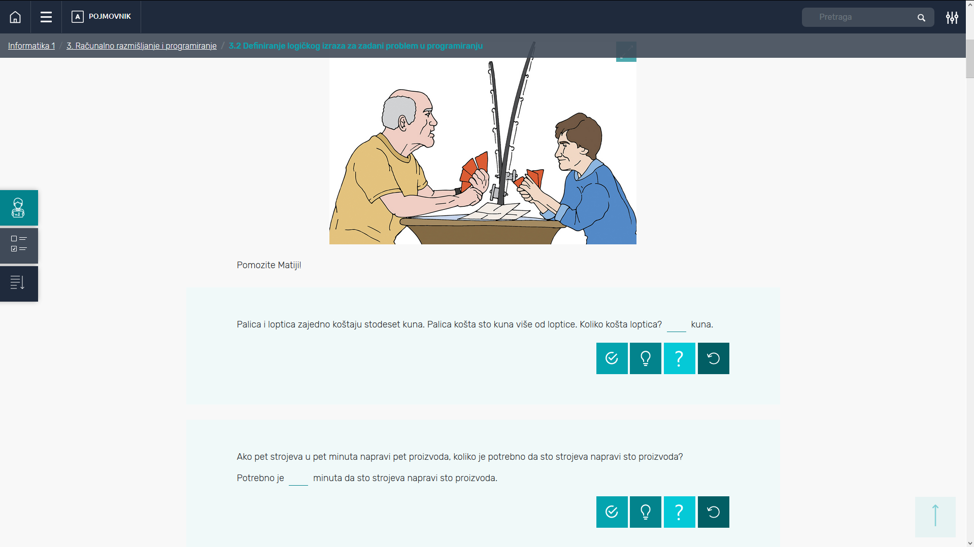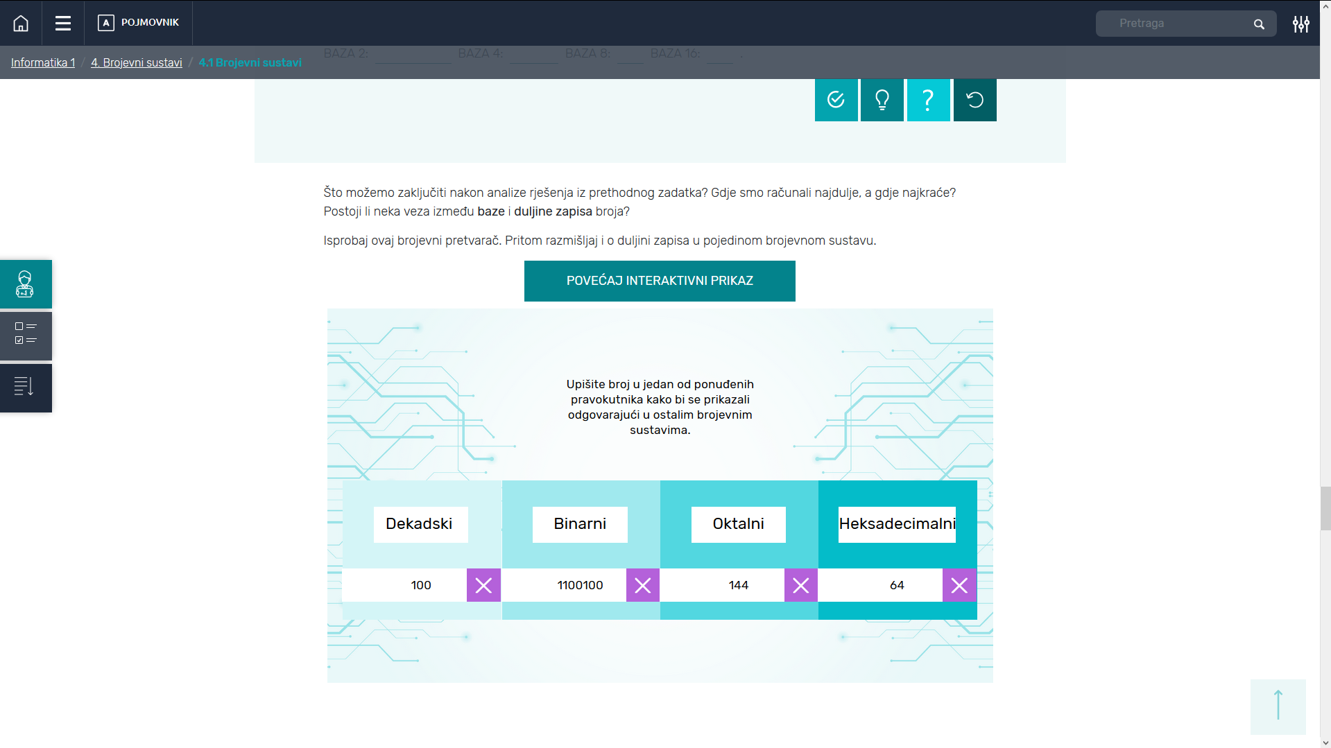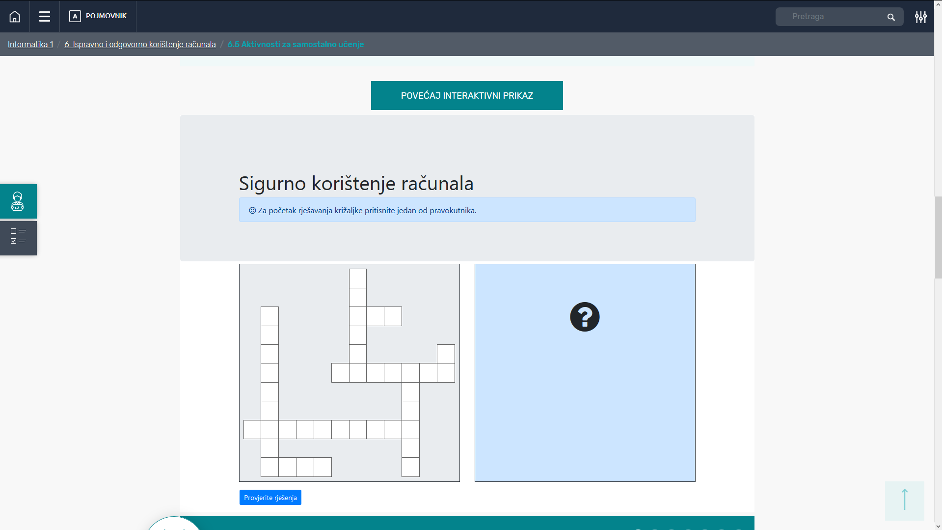 Postoje i neke složenije interaktivne vježbe i zadatke. Sadrže različite interaktivne igre, slagalice i slično. Iznad takvih vježbi nalazi se gumb kojim učenik može povećati takvu vježbu na pun ekran kako bi korištenje vježbe bilo što lakše, preglednije i ugodnije.