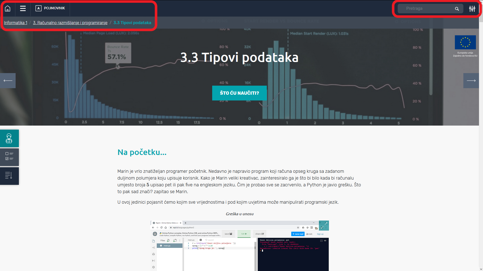 Pri vrhu zaslona nalazi se navigacijska traka koja u svakom trenutku, prikazuje u kojem se dijelu sadržaja nalazimo, a to se vidi kroz naziv predmeta, modula i jedinicu. Odabirom naziva predmeta vraćamo se na početnu stranicu s popisom modula.