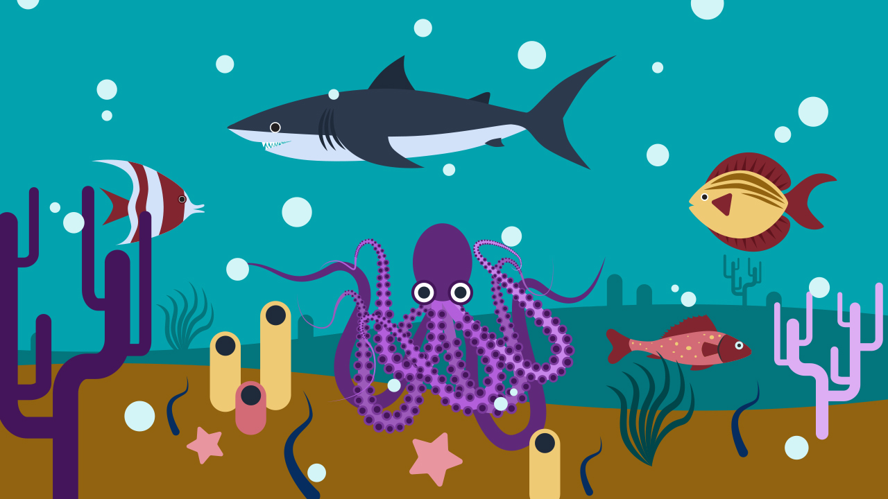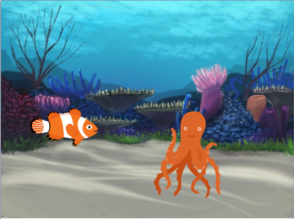 Odaberimo dva lika: ribicu (fish-a) i hobotnicu (octopus-b), a zatim dodajmo pozornicu (Underwater 2).