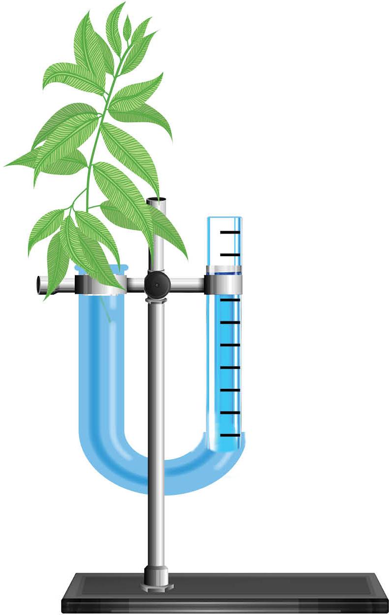Istražite virtualnim pokusom utjecaj temperature i strujanja zraka na transpiraciju. Grančica biljke postavljena je u uređaj za mjerenje transpiracije koji se sastoji od cijevi u obliku slova U na čijem se jednom kraju nalazi grančica, a na drugom kraju graduirana cijev. Cijev u obliku slova U je hermetički zatvorena na oba kraja kako bi se spriječilo isparavanje vode iz cijevi pa voda može izlaziti samo transpiracijom kroz listove biljke.
