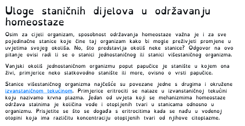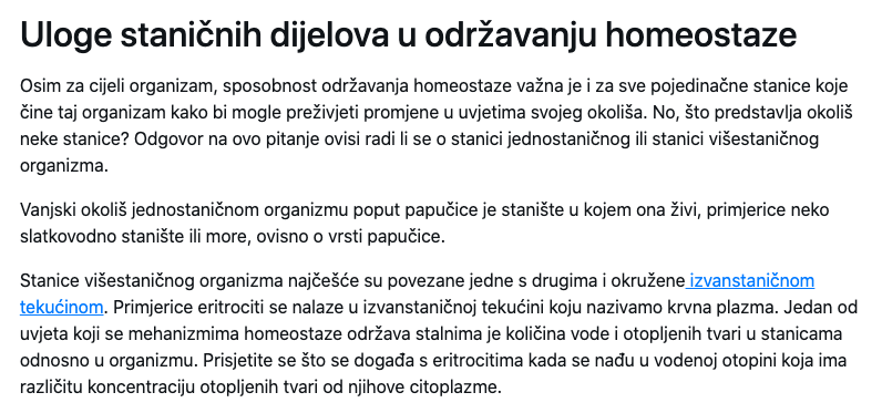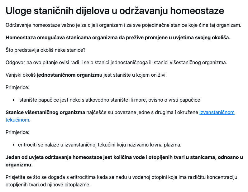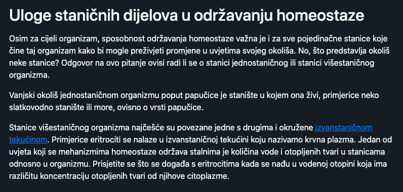 Klikom na željenu jedinicu DOS-a otvara se njezin sadržaj. Svaka jedinica započinje kratkim uvodom koji probuđuje znatiželju za predstojeći sadržaj. Slijede sadržaji koji olakšavaju proces učenja i poučavanja novoga gradiva, a podijeljeni su podnaslovima na smislene cjeline. Na lijevoj je strani izbornik koji pokazuje gdje se u jedinici trenutno nalazite te omogućuje odabir određenoga podnaslova. Jedinica završava preglednim sažetkom podnaslova „Za kraj…“.