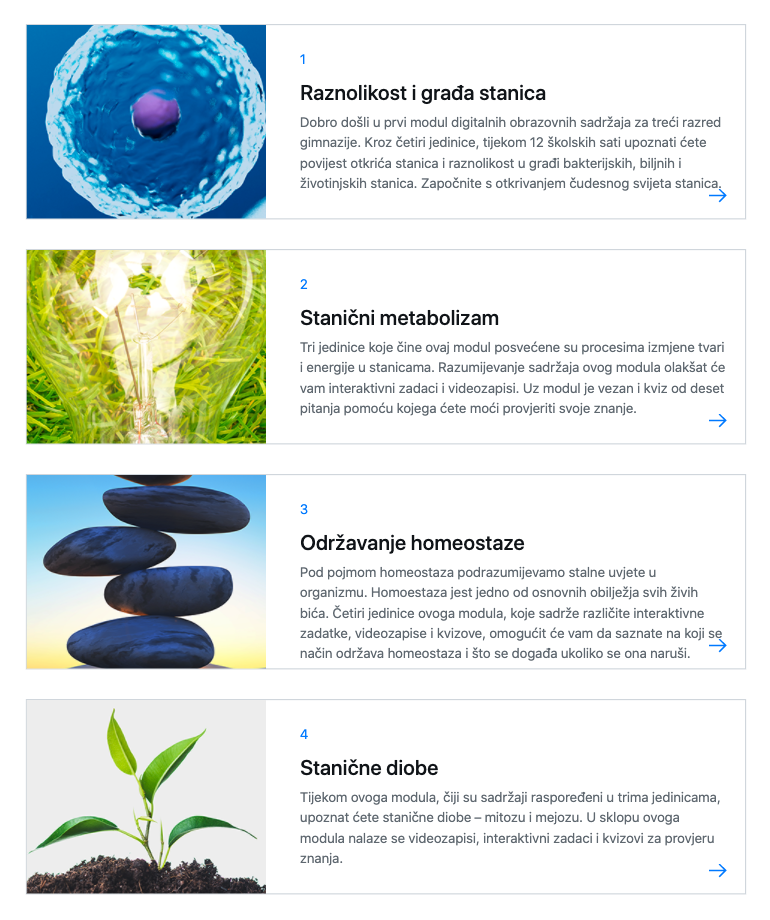 Svaki cjeloviti digitalni obrazovni sadržaj (DOS) sastoji se od nekoliko tematskih cjelina – modula. Na početnoj stranici cjelovitoga DOS-a nalazi se popis modula s kratkim opisom svakoga modula.