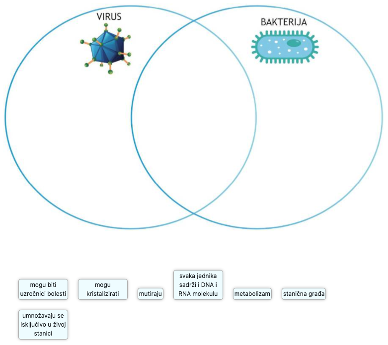 Interaktivni Vennovi dijagrami izvrsno su rješenje za analizu sličnosti i razlike određenih struktura, procesa ili organizama. Nakon popunjavanja dijagrama dobiva se povratna informacija o točnosti rješenja.