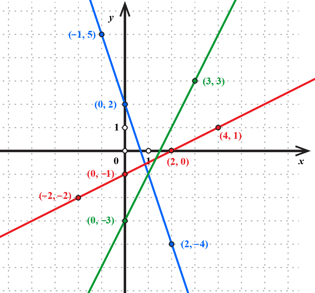 Nacrtajte na papiru bilo koje tri točke u koordinatnom sustavu. Koliko je najviše različitih pravaca određeno tim točkama? Nacrtajte ih i napišite njihove jednadžbe.