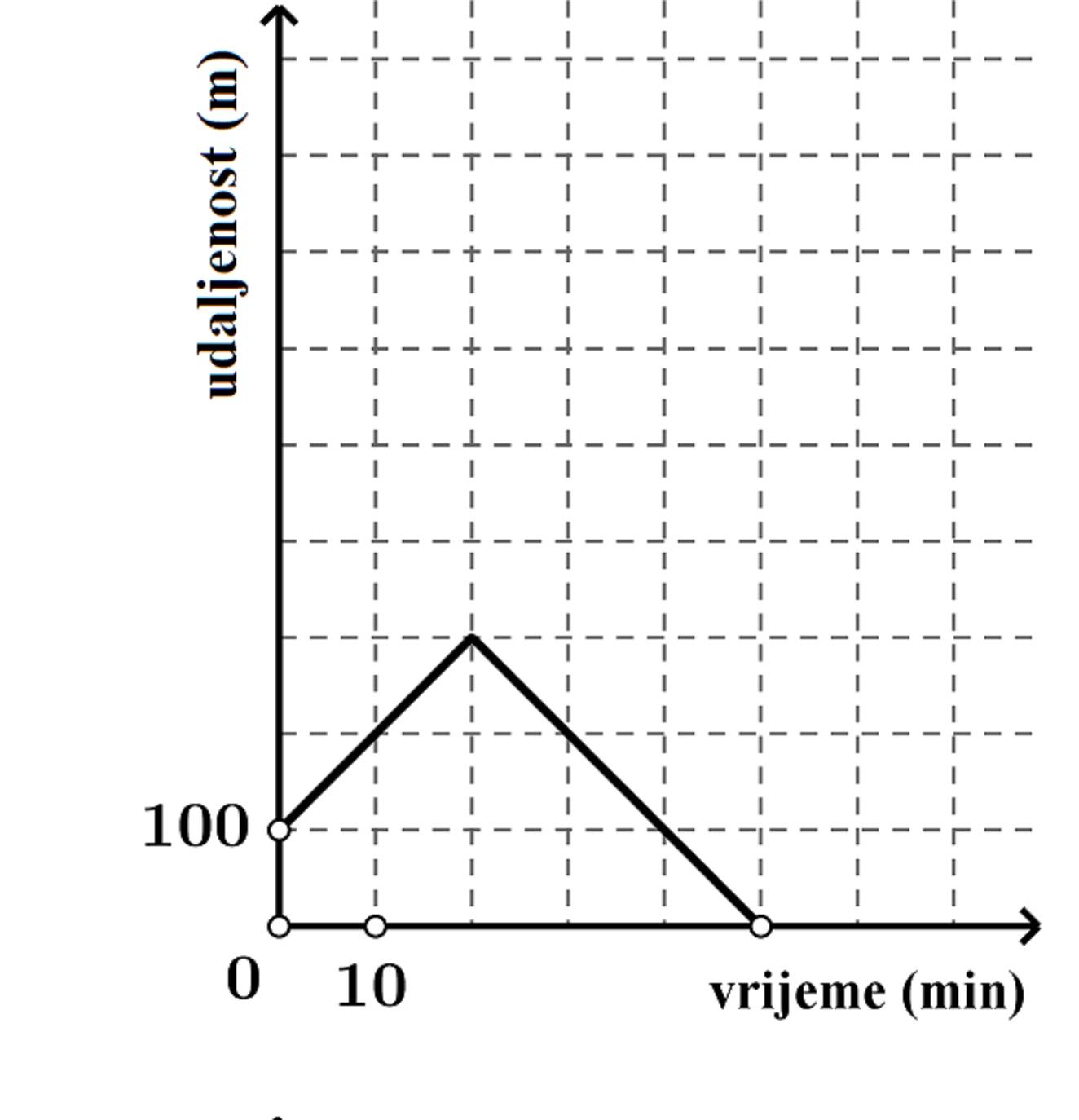 U koordinatnom je sustavu prikazan graf funkcije koji opisuje kako udaljenost od Neline kuće izražena u metrima ovisi o proteklome vremenu izraženom u minutama.