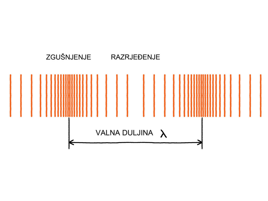 Longitudinalni val-zgušnjenja i razrjeđenja, valna duljina je razmak između dva zgušnjenje ili razrjeđenja