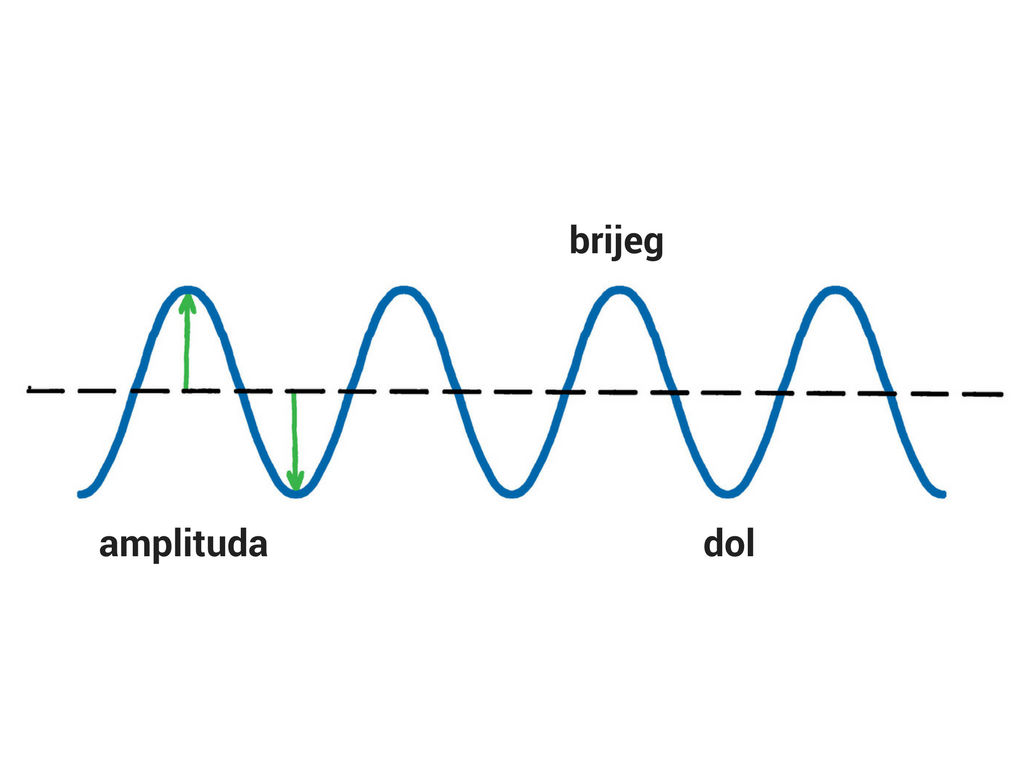 Udaljenost od ravnotežnog položaja do najviše točke brijega ili najniže točke dola naziva se amplituda, A